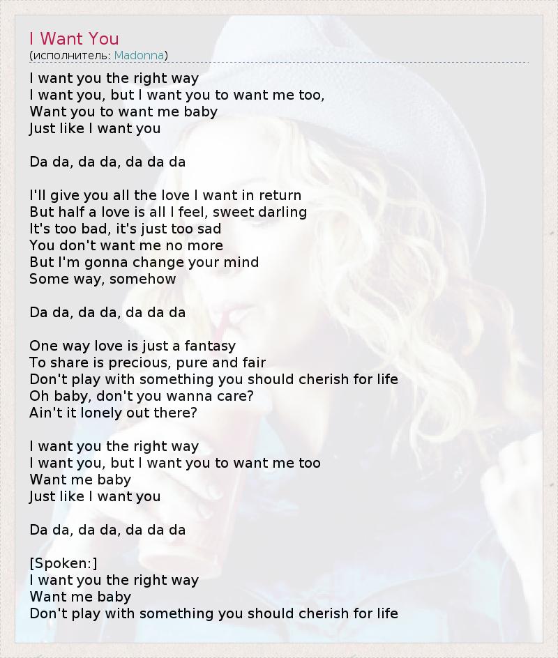 "I Want You" - кавер-версия одноимённого сингла Марвина Гэя, которая вошла в сборник баллад Мадонны "Something To Remember" и трибьют-альбом "Inner City Blues: The Music of Marvin Gaye".