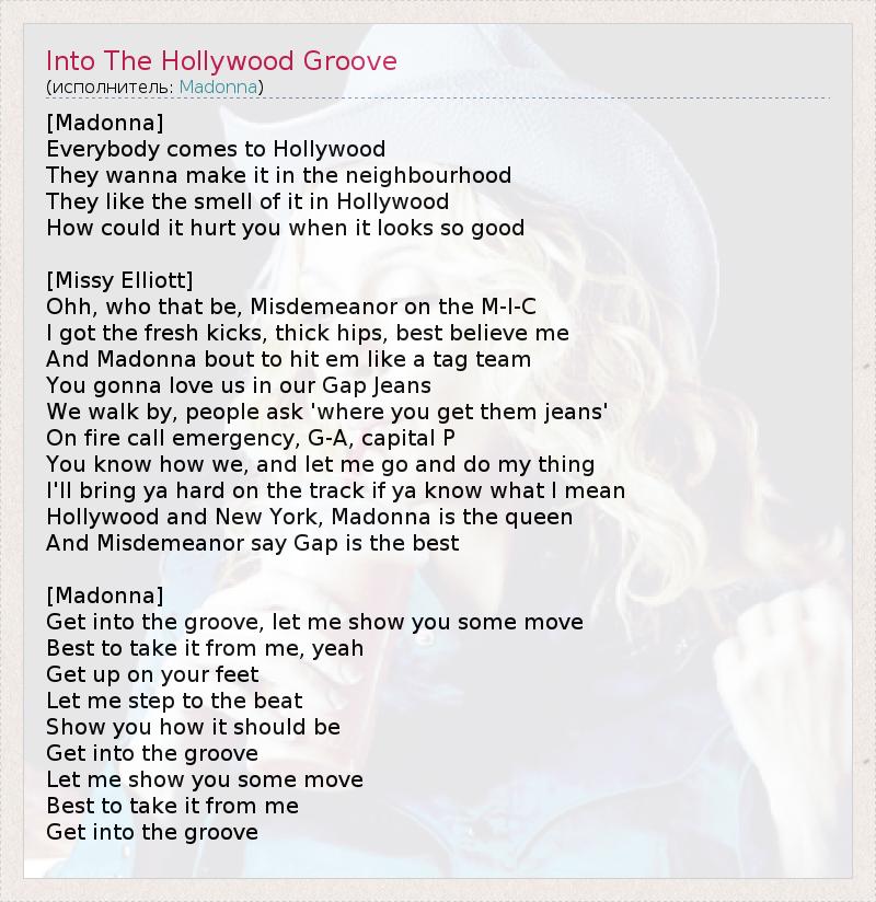 [Madonna] Everybody comes to Hollywood They wanna make it in the neighbourhood They like the smell of it in Hollywood How could it hurt you when it looks so good [Missy Elliott] Ohh, who that be, Misdemeanor on the M-I-C I got the fresh kicks, thick hips, best believe me And Madonna bout to hit em like a tag team You gonna love us in our Gap Jeans We walk by, people ask 'where you get them jeans' On fire call emergency, G-A, capital P You know how we, and let me go and do my thing I'll bring ya hard on the track if ya know what I mean Hollywood and New York, Madonna is the queen And Misdemeanor say Gap is the best [Madonna] Get into the groove, let me show you some move Best to take it from me, yeah Get up on your feet Let me step to the beat Show you how it should be Get into the groove Let me show you some move Best to take it from me Get into the groove
