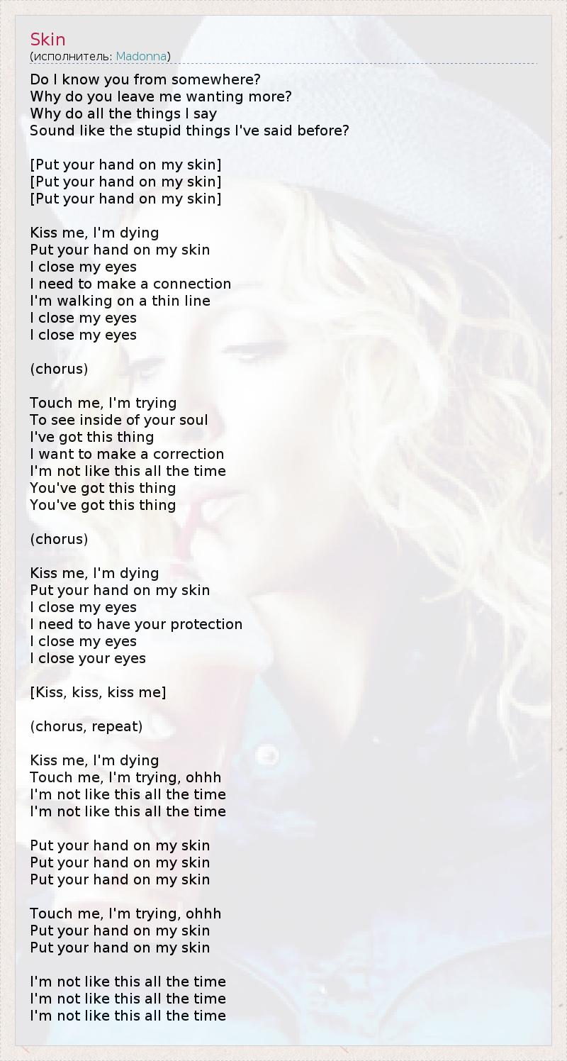 Мы где-то встречались раньше? Почему ты заставляешь меня хотеть все больше и больше? Почему все, что я говорю, Похоже на те глупости, которые я говорила раньше? Дотронься до моей кожи Дотронься до моей кожи Дотронься до моей кожи Поцелуй меня, я умираю Дотронься до моей кожи Я закрываю глаза Мне нужно установить связь Я иду по тонкой линии Я закрываю глаза Я закрываю глаза (припев) Дотронься до меня, я пытаюсь Заглянуть в твою душу Мне это удалось Я хочу внести исправления Я не похожа на себя Тебе это удалось Тебе это удалось (припев) Поцелуй меня, я умираю Дотронься до моей кожи Я закрываю глаза Мне нужна твоя защита Я закрываю глаза Я закрываю твои глаза (Поцелуй меня, поцелуй, поцелуй меня) (припев повторяется) Поцелуй меня, я умираю Дотронься до меня, я пытаюсь, ооооо Я не похожа на себя Я не похожа на себя Дотронься до моей кожи Дотронься до моей кожи Дотронься до моей кожи Дотронься до меня, я пытаюсь, ооооо Дотронься до моей кожи Дотронься до моей кожи Я не похожа на себя Я не похожа на себя Я не похожа на себя