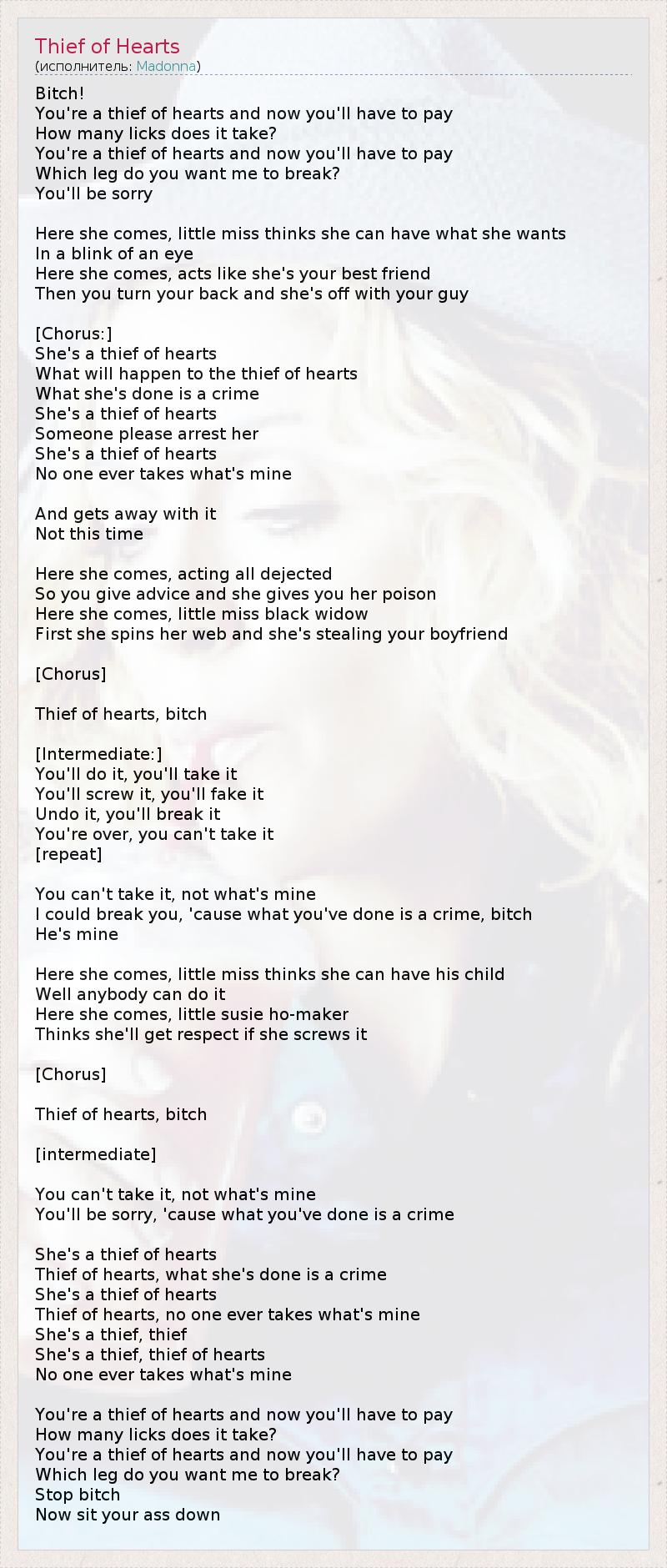 Bitch! You're a thief of hearts and now you'll have to pay How many licks does it take? You're a thief of hearts and now you'll have to pay Which leg do you want me to break? You'll be sorry Here she comes, little miss thinks she can have what she wants In a blink of an eye Here she comes, acts like she's your best friend Then you turn your back and she's off with your guy [Chorus:] She's a thief of hearts What will happen to the thief of hearts What she's done is a crime She's a thief of hearts Someone please arrest her She's a thief of hearts No one ever takes what's mine And gets away with it Not this time Here she comes, acting all dejected So you give advice and she gives you her poison Here she comes, little miss black widow First she spins her web and she's stealing your boyfriend [Chorus] Thief of hearts, bitch [Intermediate:] You'll do it, you'll take it You'll screw it, you'll fake it Undo it, you'll break it You're over, you can't take it [repeat] You can't take it, not what's mine I could break you, 'cause what you've done is a crime, bitch He's mine Here she comes, little miss thinks she can have his child Well anybody can do it Here she comes, little susie ho-maker Thinks she'll get respect if she screws it [Chorus] Thief of hearts, bitch [intermediate] You can't take it, not what's mine You'll be sorry, 'cause what you've done is a crime She's a thief of hearts Thief of hearts, what she's done is a crime She's a thief of hearts Thief of hearts, no one ever takes what's mine She's a thief, thief She's a thief, thief of hearts No one ever takes what's mine You're a thief of hearts and now you'll have to pay How many licks does it take? You're a thief of hearts and now you'll have to pay Which leg do you want me to break? Stop bitch Now sit your ass down