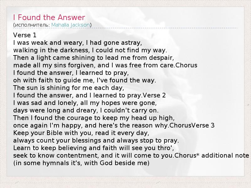 I found the answer, and I learned to pray.Verse 2