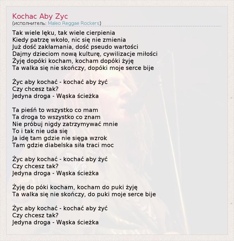 Так Wiele Leku , тaк Wiele cierpienia Kiedy patrzę wkoło , NIC się ние zmienia Юз DOSC zakłamania , DOSC псевдо wartości Dajmy dzieciom Нова Kulture , cywilizacje miłości Żyję dopóki Kocham , Kocham dopóki żyję Та walka Sie некоммерческого характера skończy , dopóki Moje серце bije ZYC абы kochać - kochać абы ZYC Czy chcesz Так ? Jedyna Droga - Waska ścieżka Та pieśń в WSZYSTKO сотрудничество мам Та Droga в WSZYSTKO сотрудничество znam Nie próbuj Nigdy zatrzymywać mnie Для Tak Nie я уда się Я. IDE ТАМ Gdzie ние Siega wzrok Там Gdzie diabelska SILA Трэйси MOC ZYC абы kochać - kochać абы ZYC Czy chcesz Так ? Jedyna Droga - Waska ścieżka Żyję сделать POKI Kocham , Kocham сделать Puki żyję Та walka Sie некоммерческого характера skończy , сделать Puki Moje серце bije ZYC абы kochać - kochać абы ZYC Czy chcesz Так ? Jedyna Droga - Waska ścieżka