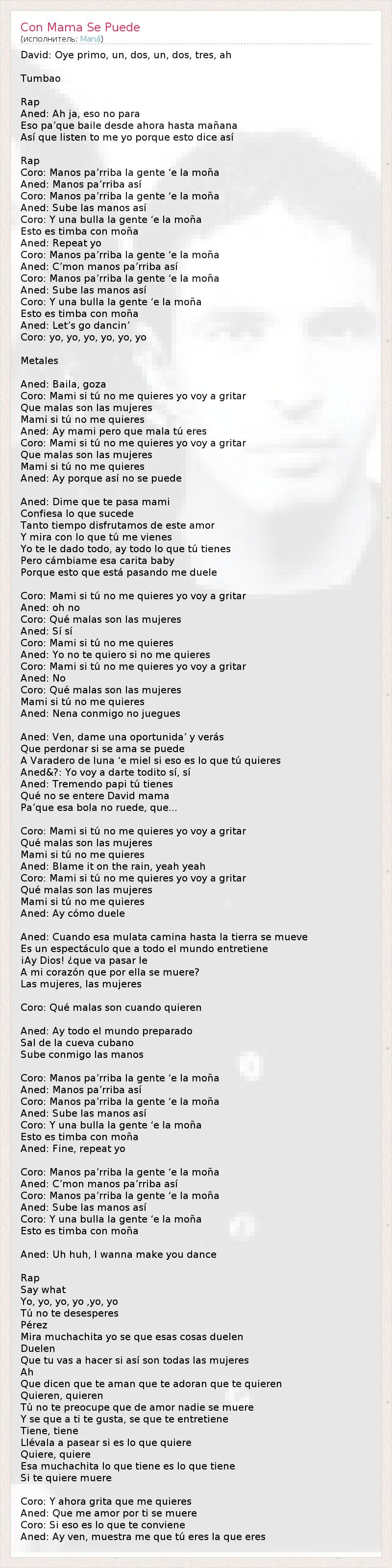 David: Oye primo, un, dos, un, dos, tres, ah Tumbao Rap Aned: Ah ja, eso no para Eso pa’que baile desde ahora hasta mañana Así que listen to me yo porque esto dice así Rap Coro: Manos pa’rriba la gente ‘e la moña Aned: Manos pa’rriba así Coro: Manos pa’rriba la gente ‘e la moña Aned: Sube las manos así Coro: Y una bulla la gente ‘e la moña Esto es timba con moña Aned: Repeat yo Coro: Manos pa’rriba la gente ‘e la moña Aned: C’mon manos pa’rriba así Coro: Manos pa’rriba la gente ‘e la moña Aned: Sube las manos así Coro: Y una bulla la gente ‘e la moña Esto es timba con moña Aned: Let’s go dancin’ Coro: yo, yo, yo, yo, yo, yo Metales Aned: Baila, goza Coro: Mami si tú no me quieres yo voy a gritar Que malas son las mujeres Mami si tú no me quieres Aned: Ay mami pero que mala tú eres Coro: Mami si tú no me quieres yo voy a gritar Que malas son las mujeres Mami si tú no me quieres Aned: Ay porque así no se puede Aned: Dime que te pasa mami Confiesa lo que sucede Tanto tiempo disfrutamos de este amor Y mira con lo que tú me vienes Yo te le dado todo, ay todo lo que tú tienes Pero cámbiame esa carita baby Porque esto que está pasando me duele Coro: Mami si tú no me quieres yo voy a gritar Aned: oh no Coro: Qué malas son las mujeres Aned: Sí sí Coro: Mami si tú no me quieres Aned: Yo no te quiero si no me quieres Coro: Mami si tú no me quieres yo voy a gritar Aned: No Coro: Qué malas son las mujeres Mami si tú no me quieres Aned: Nena conmigo no juegues Aned: Ven, dame una oportunida’ y verás Que perdonar si se ama se puede A Varadero de luna ‘e miel si eso es lo que tú quieres Aned&?: Yo voy a darte todito sí, sí Aned: Tremendo papi tú tienes Qué no se entere David mama Pa’que esa bola no ruede, que... Coro: Mami si tú no me quieres yo voy a gritar Qué malas son las mujeres Mami si tú no me quieres Aned: Blame it on the rain, yeah yeah Coro: Mami si tú no me quieres yo voy a gritar Qué malas son las mujeres Mami si tú no me quieres Aned: Ay cómo duele Aned: Cuando esa mulata camina hasta la tierra se mueve Es un espectáculo que a todo el mundo entretiene ¡Ay Dios! ¿que va pasar le A mi corazón que por ella se muere? Las mujeres, las mujeres Coro: Qué malas son cuando quieren Aned: Ay todo el mundo preparado Sal de la cueva cubano Sube conmigo las manos Coro: Manos pa’rriba la gente ‘e la moña Aned: Manos pa’rriba así Coro: Manos pa’rriba la gente ‘e la moña Aned: Sube las manos así Coro: Y una bulla la gente ‘e la moña Esto es timba con moña Aned: Fine, repeat yo Coro: Manos pa’rriba la gente ‘e la moña Aned: C’mon manos pa’rriba así Coro: Manos pa’rriba la gente ‘e la moña Aned: Sube las manos así Coro: Y una bulla la gente ‘e la moña Esto es timba con moña Aned: Uh huh, I wanna make you dance Rap Say what Yo, yo, yo, yo ,yo, yo Tú no te desesperes Pérez Mira muchachita yo se que esas cosas duelen Duelen Que tu vas a hacer si así son todas las mujeres Ah Que dicen que te aman que te adoran que te quieren Quieren, quieren Tú no te preocupe que de amor nadie se muere Y se que a ti te gusta, se que te entretiene Tiene, tiene Llévala a pasear si es lo que quiere Quiere, quiere Esa muchachita lo que tiene es lo que tiene Si te quiere muere Coro: Y ahora grita que me quieres Aned: Que me amor por ti se muere Coro: Si eso es lo que te conviene Aned: Ay ven, muestra me que tú eres la que eres