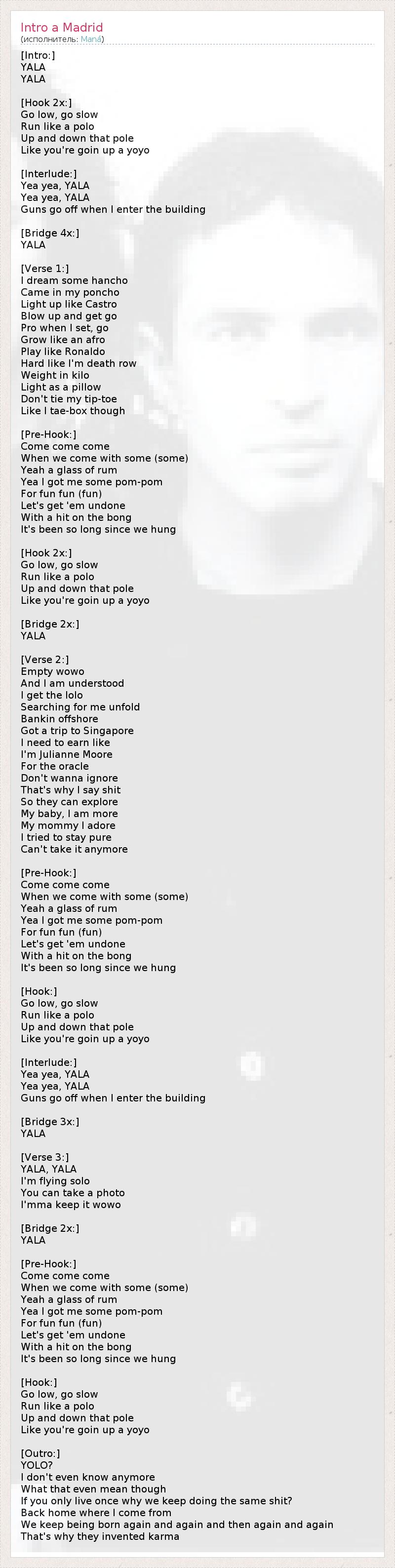 Это интересно:Maná - это популярная мексиканская поп-рок группа. Продано более 22 миллионов копий альбомов группы. Награды: Грэмми, пять Латинских Грэмми, пять MTV Video Music Awards Latin America, три Premios Juventud awards, пять Billboard Latin Music Awards и 12 Premios Lo Nuestro awards. Одна из самых популярных рок-групп Латинской Америки.
