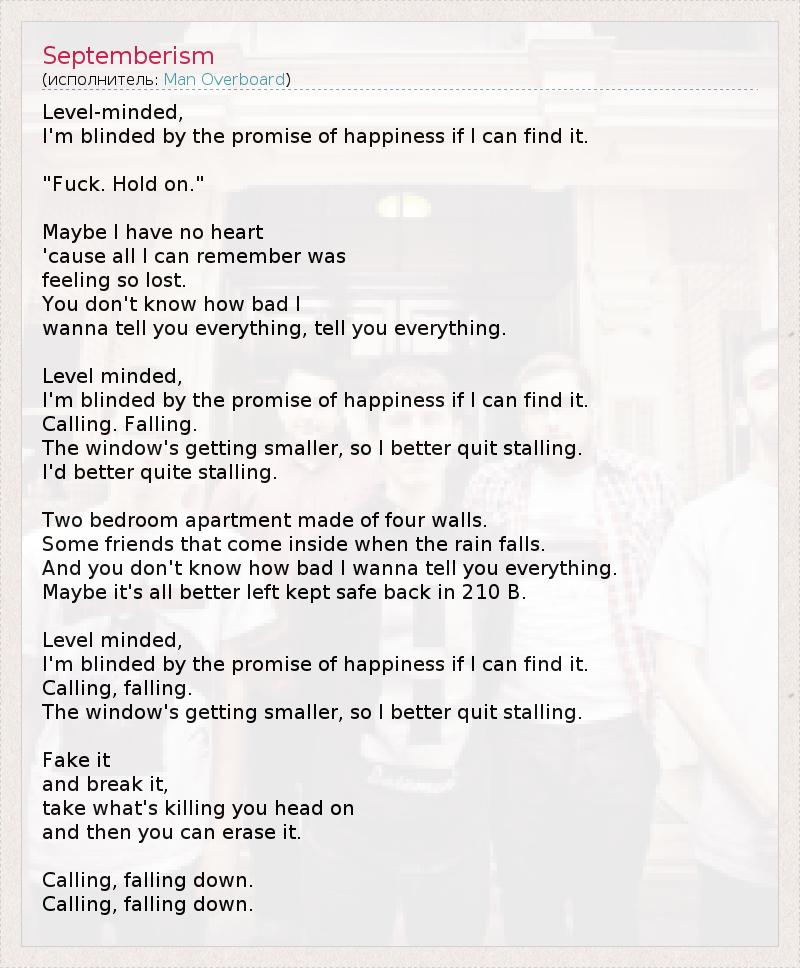 Это интересно:Man Overboard - американская поп-панк группа из Южного Джерси, созданная в 2008. С тех пор, они выпустили два обычных EP, один акустический EP, совместную запись с бостонской поп-панк группой Transit, а также сборник старых песен и три полноформатных альбомов. На них оказали влияние такие группы, как Blink-182, Saves the Day и Taking Back Sunday. На данный момент у группы подписан контракт с лейблом Rise Records.... продолжение