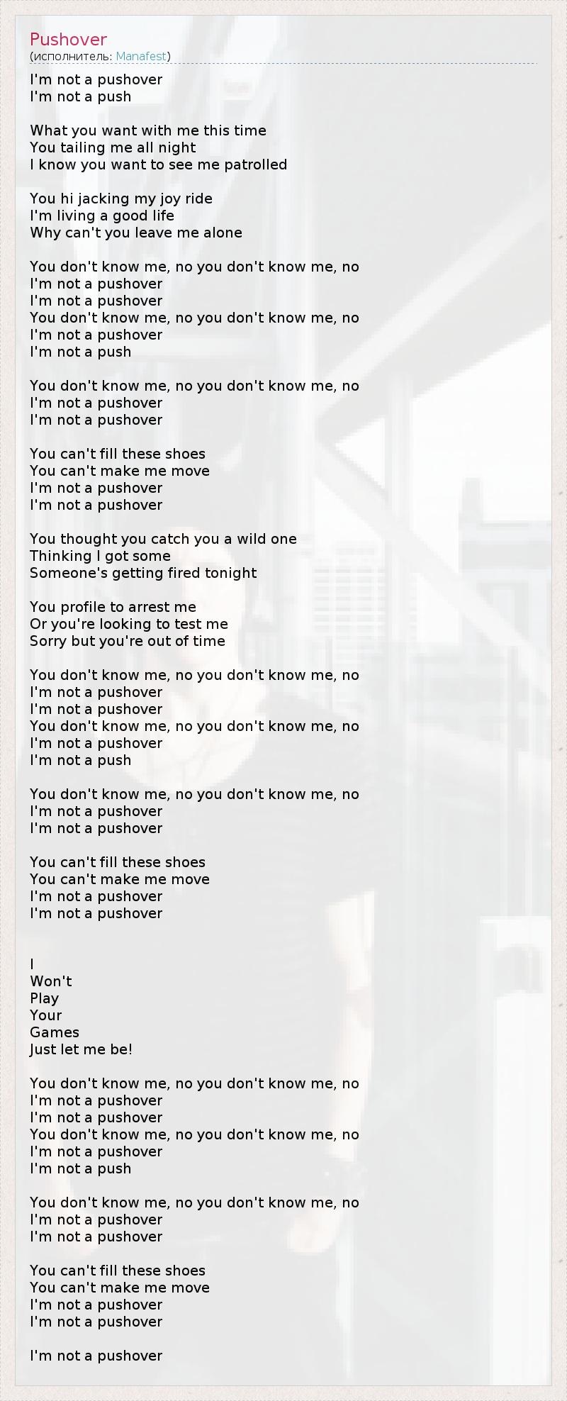 I'm not a pushover I'm not a push What you want with me this time You tailing me all night I know you want to see me patrolled You hi jacking my joy ride I'm living a good life Why can't you leave me alone You don't know me, no you don't know me, no I'm not a pushover I'm not a pushover You don't know me, no you don't know me, no I'm not a pushover I'm not a push You don't know me, no you don't know me, no I'm not a pushover I'm not a pushover You can't fill these shoes You can't make me move I'm not a pushover I'm not a pushover You thought you catch you a wild one Thinking I got some Someone's getting fired tonight You profile to arrest me Or you're looking to test me Sorry but you're out of time You don't know me, no you don't know me, no I'm not a pushover I'm not a pushover You don't know me, no you don't know me, no I'm not a pushover I'm not a push You don't know me, no you don't know me, no I'm not a pushover I'm not a pushover You can't fill these shoes You can't make me move I'm not a pushover I'm not a pushover I Won't Play Your Games Just let me be! You don't know me, no you don't know me, no I'm not a pushover I'm not a pushover You don't know me, no you don't know me, no I'm not a pushover I'm not a push You don't know me, no you don't know me, no I'm not a pushover I'm not a pushover You can't fill these shoes You can't make me move I'm not a pushover I'm not a pushover I'm not a pushover