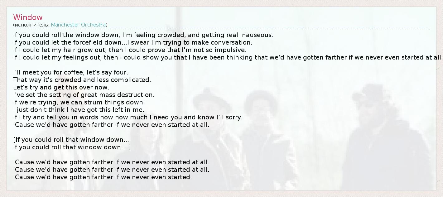 Это интересно:Весьма красочная палитра очень талантливых музыкантов из Атланты. Коллектив был образован в 2004 году.Первым и инициирующим участником группы явился Энди Хулл (вокал и первая гитара). С последнего класса школы Энди стремился посвящать творчеству как можно больше времени и сил, создавая набросочный материал для последующего рождения Манчестера. После Энди в группе появились Джереми... продолжение