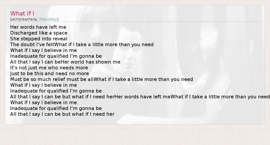 All that I say I can be but what if I need herHer words have left meWhat if I take a little more than you need