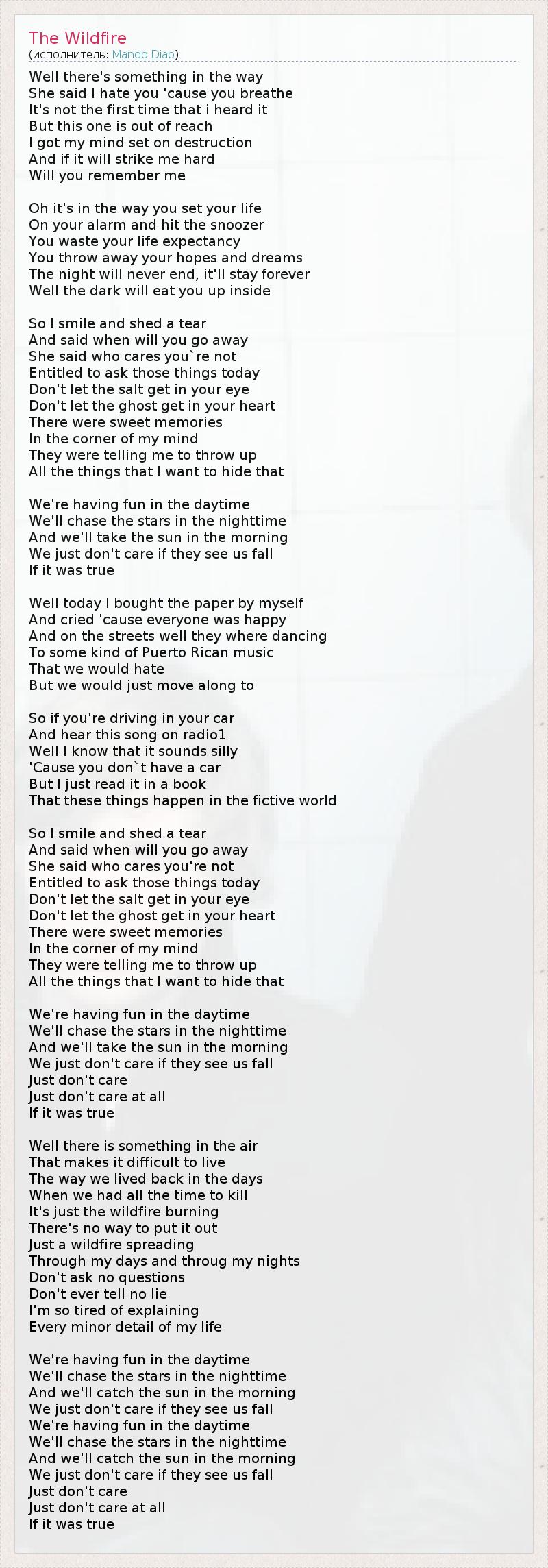 А как ты думаешь, о чем песня "The Wildfire" ?