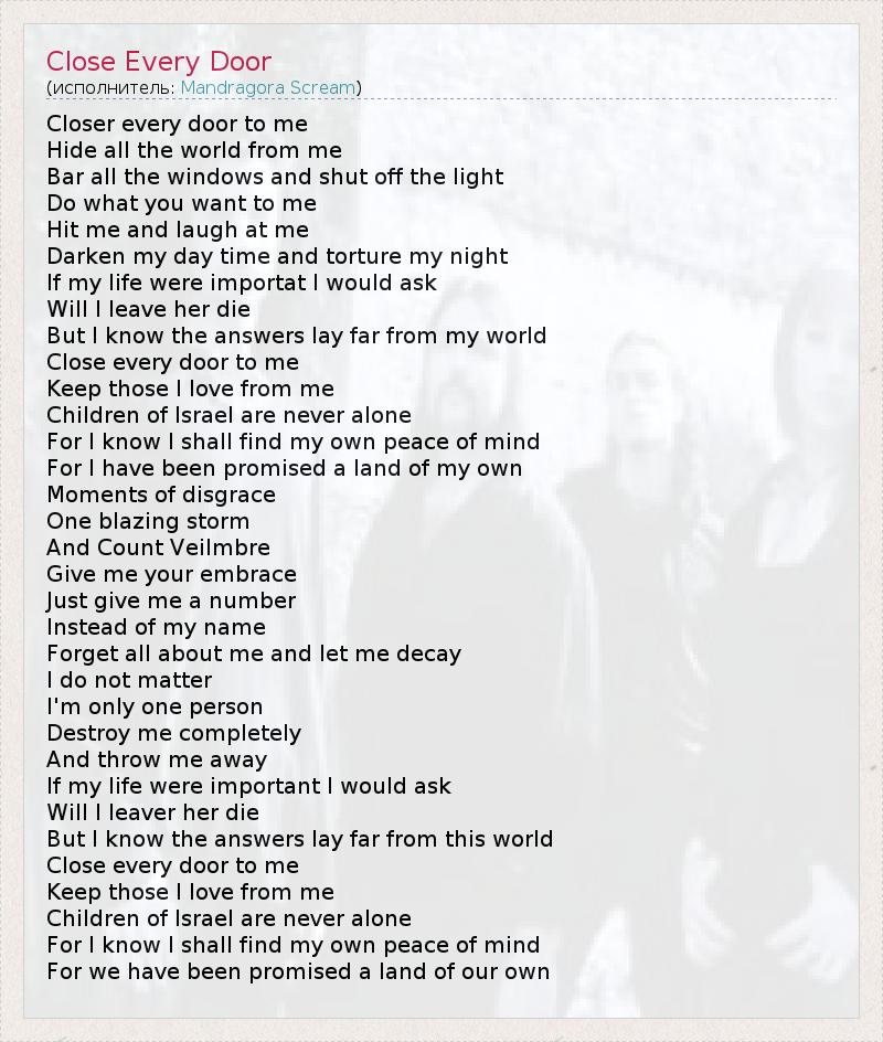 Closer every door to me Hide all the world from me Bar all the windows and shut off the light Do what you want to me Hit me and laugh at me Darken my day time and torture my night If my life were importat I would ask Will I leave her die But I know the answers lay far from my world Close every door to me Keep those I love from me Children of Israel are never alone For I know I shall find my own peace of mind For I have been promised a land of my own Moments of disgrace One blazing storm And Count Veilmbre Give me your embrace Just give me a number Instead of my name Forget all about me and let me decay I do not matter I'm only one person Destroy me completely And throw me away If my life were important I would ask Will I leaver her die But I know the answers lay far from this world Close every door to me Keep those I love from me Children of Israel are never alone For I know I shall find my own peace of mind For we have been promised a land of our own