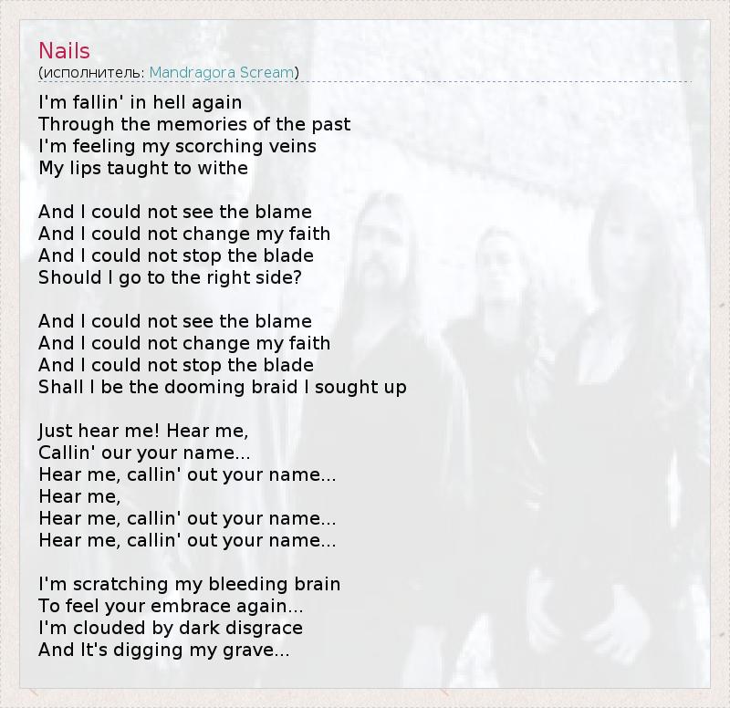 I'm fallin' in hell again Through the memories of the past I'm feeling my scorching veins My lips taught to withe And I could not see the blame And I could not change my faith And I could not stop the blade Should I go to the right side? And I could not see the blame And I could not change my faith And I could not stop the blade Shall I be the dooming braid I sought up Just hear me! Hear me, Callin' our your name... Hear me, callin' out your name... Hear me, Hear me, callin' out your name... Hear me, callin' out your name... I'm scratching my bleeding brain To feel your embrace again... I'm clouded by dark disgrace And It's digging my grave...