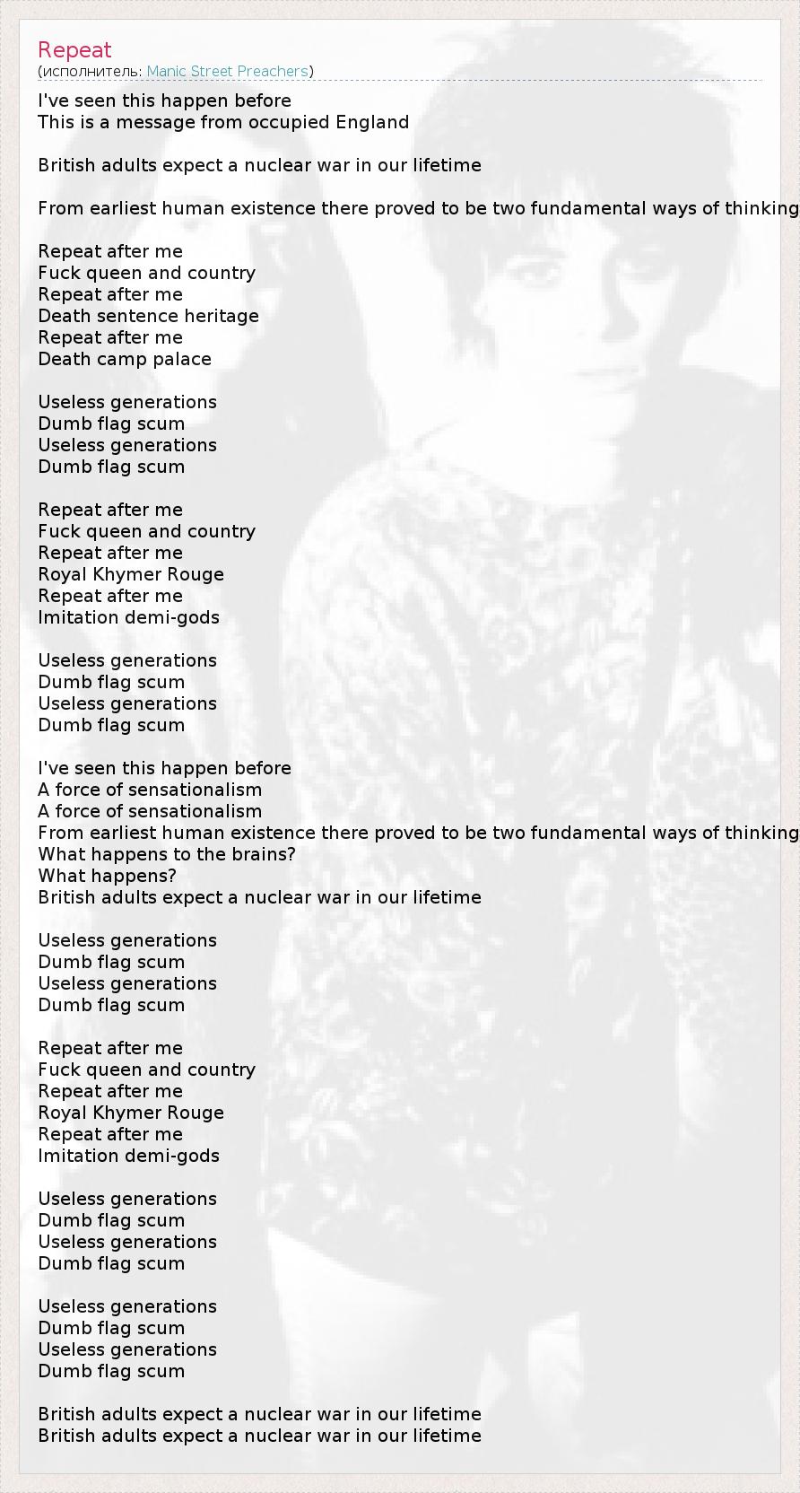 Все песни были написаны Ники Уайром и Ричи Эдвардсом. Вся музыка была написана Джеймсом Дином Брэдфилдом и Шоном Муром (за исключением "Damn Dog", которая является кавером на песню the Sleez Sisters из фильма 1980 года "Times Square").
