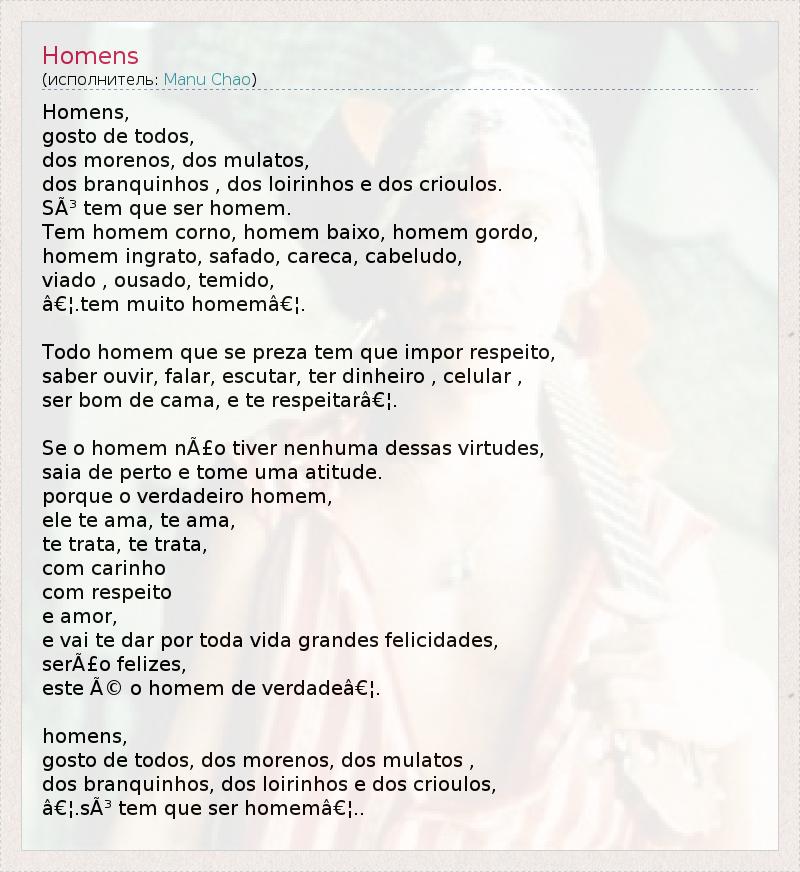 Это интересно:Ману Чао (José-Manuel Thomas Arthur Chao, род. 21 июня 1961 г. в Париже) — музыкант галисийского происхождения. Известен как сольный музыкант и как лидер группы Mano Negra. Его музыку можно охарактеризовать как сплав рока и латиноамериканской музыки. Тексты песен Ману написаны на французском, испанском, галисийском, арабском и английском языках.Ману Чао родился в Париже в семье испанцев, иммигрировавших... продолжение