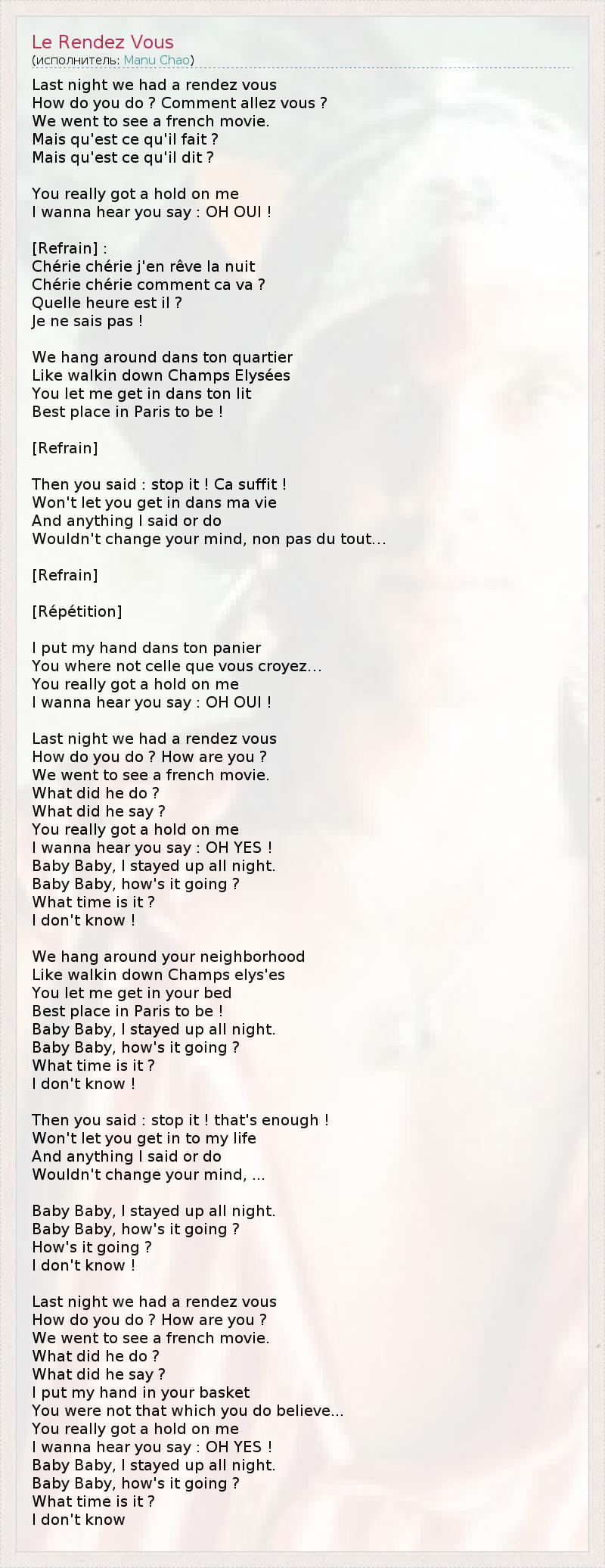 Last night we had a rendez vous How do you do ? Comment allez vous ? We went to see a french movie. Mais qu'est ce qu'il fait ? Mais qu'est ce qu'il dit ? You really got a hold on me I wanna hear you say : OH OUI ! [Refrain] : Chérie chérie j'en rêve la nuit Chérie chérie comment ca va ? Quelle heure est il ? Je ne sais pas ! We hang around dans ton quartier Like walkin down Champs Elysées You let me get in dans ton lit Best place in Paris to be ! [Refrain] Then you said : stop it ! Ca suffit ! Won't let you get in dans ma vie And anything I said or do Wouldn't change your mind, non pas du tout… [Refrain] [Répétition] I put my hand dans ton panier You where not celle que vous croyez… You really got a hold on me I wanna hear you say : OH OUI ! Last night we had a rendez vous How do you do ? How are you ? We went to see a french movie. What did he do ? What did he say ? You really got a hold on me I wanna hear you say : OH YES ! Baby Baby, I stayed up all night. Baby Baby, how's it going ? What time is it ? I don't know ! We hang around your neighborhood Like walkin down Champs elys'es You let me get in your bed Best place in Paris to be ! Baby Baby, I stayed up all night. Baby Baby, how's it going ? What time is it ? I don't know ! Then you said : stop it ! that's enough ! Won't let you get in to my life And anything I said or do Wouldn't change your mind, ... Baby Baby, I stayed up all night. Baby Baby, how's it going ? How's it going ? I don't know ! Last night we had a rendez vous How do you do ? How are you ? We went to see a french movie. What did he do ? What did he say ? I put my hand in your basket You were not that which you do believe... You really got a hold on me I wanna hear you say : OH YES ! Baby Baby, I stayed up all night. Baby Baby, how's it going ? What time is it ? I don't know