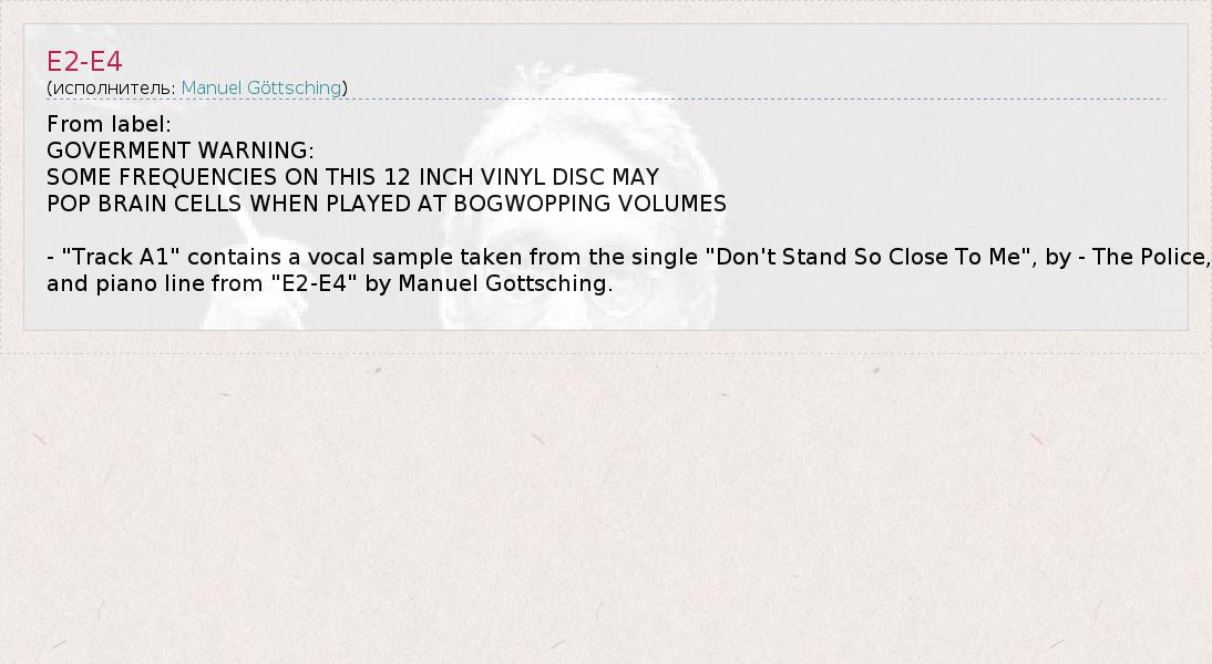 - "Track A1" contains a vocal sample taken from the single "Don't Stand So Close To Me", by - The Police,