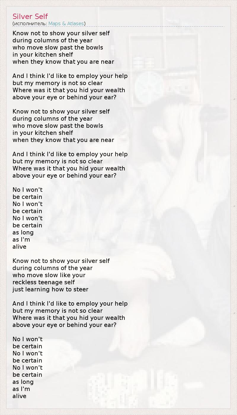 Know not to show your silver self during columns of the year who move slow past the bowls in your kitchen shelf when they know that you are near And I think I'd like to employ your help but my memory is not so clear Where was it that you hid your wealth above your eye or behind your ear? Know not to show your silver self during columns of the year who move slow past the bowls in your kitchen shelf when they know that you are near And I think I'd like to employ your help but my memory is not so clear Where was it that you hid your wealth above your eye or behind your ear? No I won't be certain No I won't be certain No I won't be certain as long as I'm alive Know not to show your silver self during columns of the year who move slow like your reckless teenage self just learning how to steer And I think I'd like to employ your help but my memory is not so clear Where was it that you hid your wealth above your eye or behind your ear? No I won't be certain No I won't be certain No I won't be certain as long as I'm alive