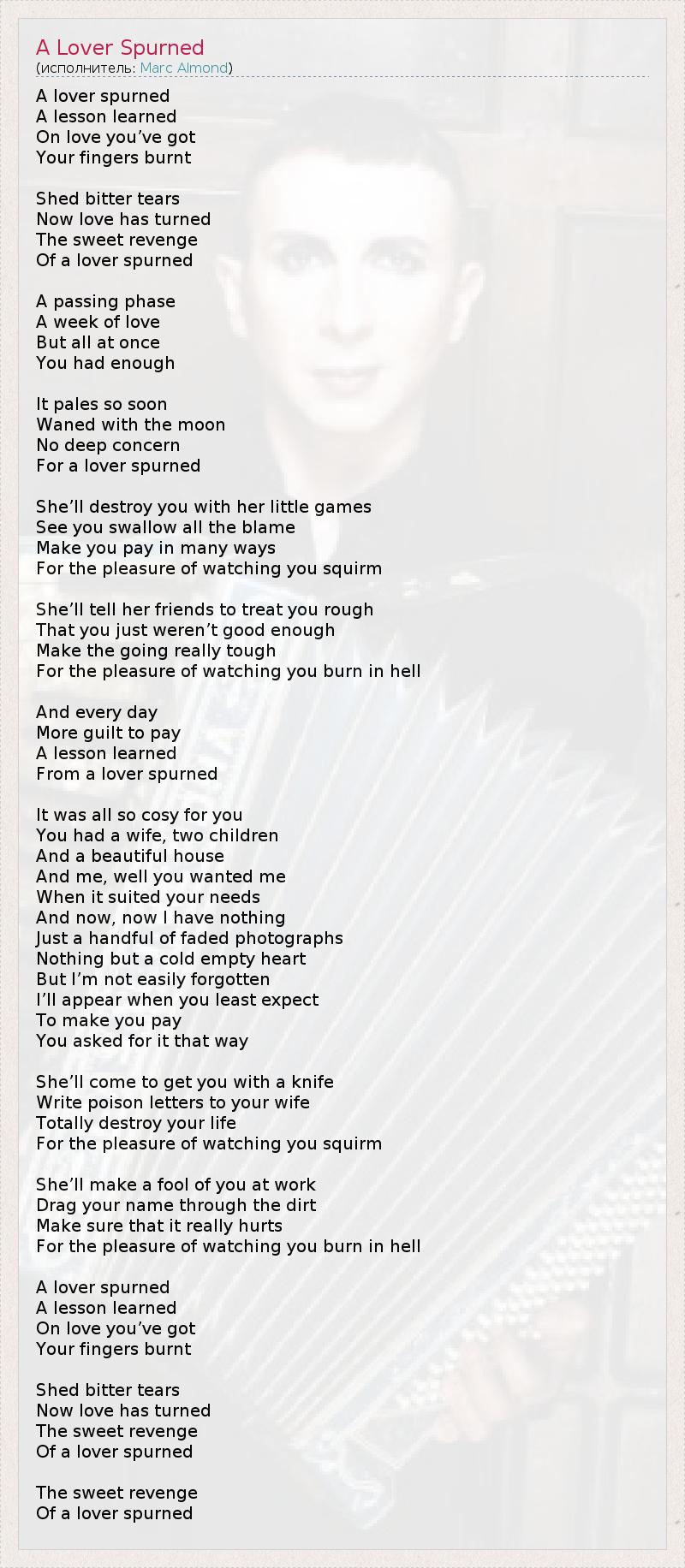 A lover spurned A lesson learned On love you’ve got Your fingers burnt Shed bitter tears Now love has turned The sweet revenge Of a lover spurned A passing phase A week of love But all at once You had enough It pales so soon Waned with the moon No deep concern For a lover spurned She’ll destroy you with her little games See you swallow all the blame Make you pay in many ways For the pleasure of watching you squirm She’ll tell her friends to treat you rough That you just weren’t good enough Make the going really tough For the pleasure of watching you burn in hell And every day More guilt to pay A lesson learned From a lover spurned It was all so cosy for you You had a wife, two children And a beautiful house And me, well you wanted me When it suited your needs And now, now I have nothing Just a handful of faded photographs Nothing but a cold empty heart But I’m not easily forgotten I’ll appear when you least expect To make you pay You asked for it that way She’ll come to get you with a knife Write poison letters to your wife Totally destroy your life For the pleasure of watching you squirm She’ll make a fool of you at work Drag your name through the dirt Make sure that it really hurts For the pleasure of watching you burn in hell A lover spurned A lesson learned On love you’ve got Your fingers burnt Shed bitter tears Now love has turned The sweet revenge Of a lover spurned The sweet revenge Of a lover spurned