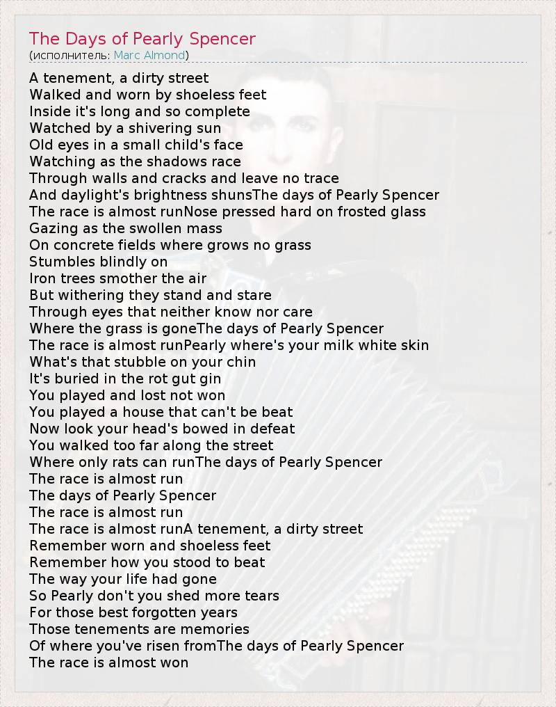 A tenement, a dirty street Walked and worn by shoeless feet Inside it's long and so complete Watched by a shivering sun Old eyes in a small child's face Watching as the shadows race Through walls and cracks and leave no trace And daylight's brightness shunsThe days of Pearly Spencer The race is almost runNose pressed hard on frosted glass Gazing as the swollen mass On concrete fields where grows no grass Stumbles blindly on Iron trees smother the air But withering they stand and stare Through eyes that neither know nor care Where the grass is goneThe days of Pearly Spencer The race is almost runPearly where's your milk white skin What's that stubble on your chin It's buried in the rot gut gin You played and lost not won You played a house that can't be beat Now look your head's bowed in defeat You walked too far along the street Where only rats can runThe days of Pearly Spencer The race is almost run The days of Pearly Spencer The race is almost run The race is almost runA tenement, a dirty street Remember worn and shoeless feet Remember how you stood to beat The way your life had gone So Pearly don't you shed more tears For those best forgotten years Those tenements are memories Of where you've risen fromThe days of Pearly Spencer The race is almost won