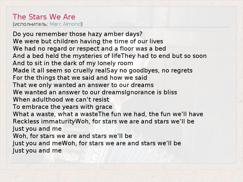 А как ты думаешь, о чем песня "The Stars We Are" ?