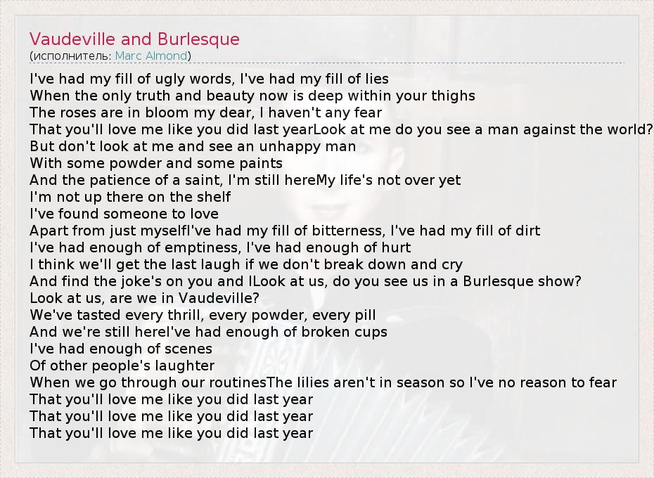 А как ты думаешь, о чем песня "Vaudeville and Burlesque" ?