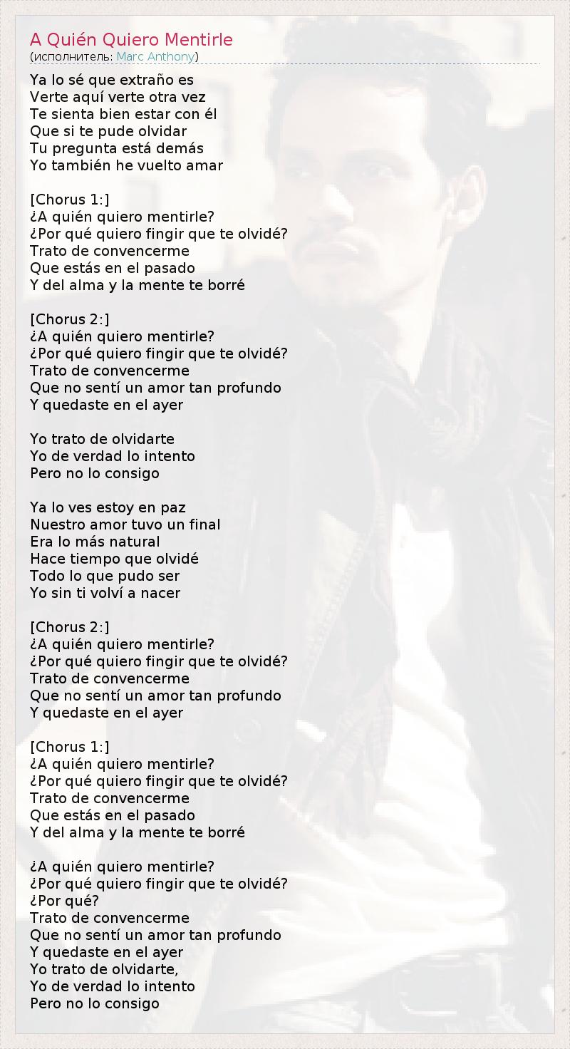 Ya lo sé que extraño es Verte aquí verte otra vez Te sienta bien estar con él Que si te pude olvidar Tu pregunta está demás Yo también he vuelto amar [Chorus 1:] ¿A quién quiero mentirle? ¿Por qué quiero fingir que te olvidé? Trato de convencerme Que estás en el pasado Y del alma y la mente te borré [Chorus 2:] ¿A quién quiero mentirle? ¿Por qué quiero fingir que te olvidé? Trato de convencerme Que no sentí un amor tan profundo Y quedaste en el ayer Yo trato de olvidarte Yo de verdad lo intento Pero no lo consigo Ya lo ves estoy en paz Nuestro amor tuvo un final Era lo más natural Hace tiempo que olvidé Todo lo que pudo ser Yo sin ti volví a nacer [Chorus 2:] ¿A quién quiero mentirle? ¿Por qué quiero fingir que te olvidé? Trato de convencerme Que no sentí un amor tan profundo Y quedaste en el ayer [Chorus 1:] ¿A quién quiero mentirle? ¿Por qué quiero fingir que te olvidé? Trato de convencerme Que estás en el pasado Y del alma y la mente te borré ¿A quién quiero mentirle? ¿Por qué quiero fingir que te olvidé? ¿Por qué? Trato de convencerme Que no sentí un amor tan profundo Y quedaste en el ayer Yo trato de olvidarte, Yo de verdad lo intento Pero no lo consigo