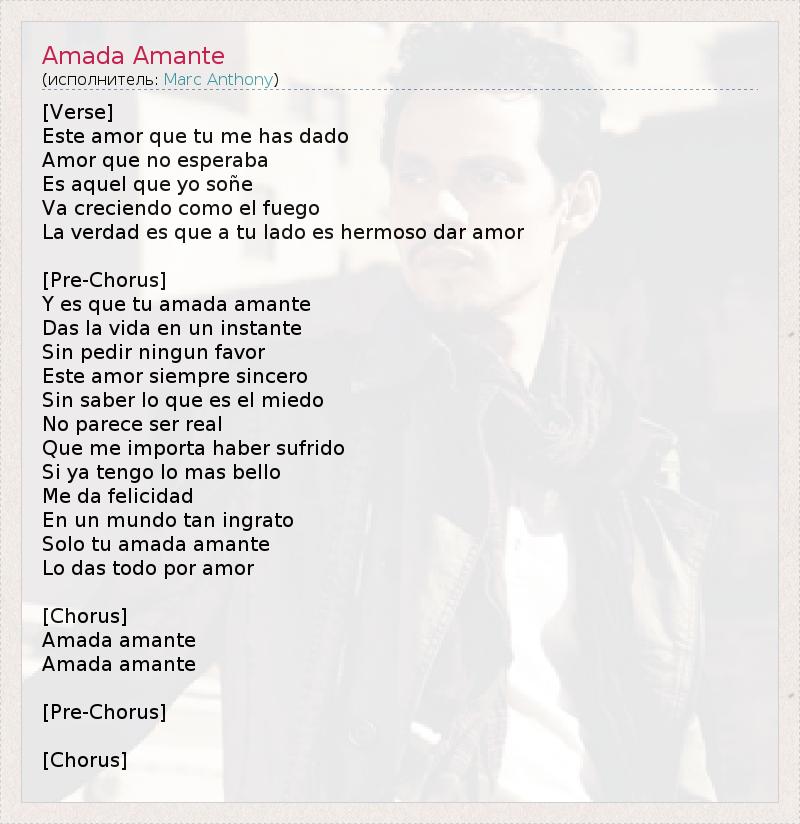 [Verse] Este amor que tu me has dado Amor que no esperaba Es aquel que yo soñe Va creciendo como el fuego La verdad es que a tu lado es hermoso dar amor [Pre-Chorus] Y es que tu amada amante Das la vida en un instante Sin pedir ningun favor Este amor siempre sincero Sin saber lo que es el miedo No parece ser real Que me importa haber sufrido Si ya tengo lo mas bello Me da felicidad En un mundo tan ingrato Solo tu amada amante Lo das todo por amor [Chorus] Amada amante Amada amante [Pre-Chorus] [Chorus]