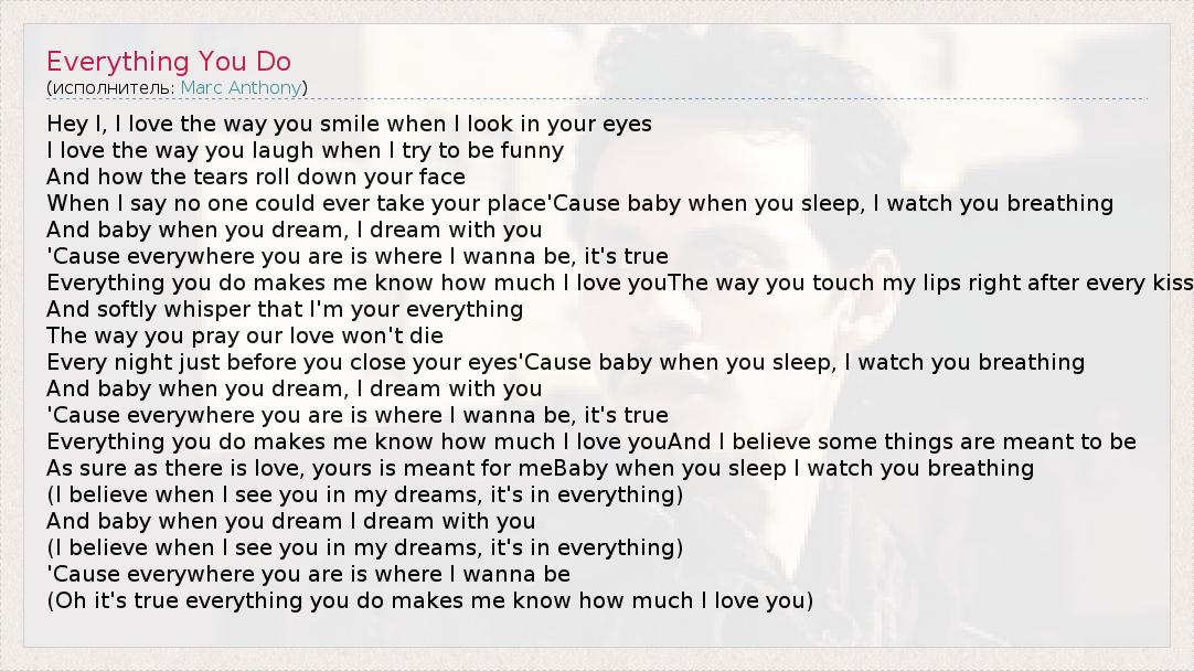 Hey I, I love the way you smile when I look in your eyes I love the way you laugh when I try to be funny And how the tears roll down your face When I say no one could ever take your place'Cause baby when you sleep, I watch you breathing And baby when you dream, I dream with you 'Cause everywhere you are is where I wanna be, it's true Everything you do makes me know how much I love youThe way you touch my lips right after every kiss And softly whisper that I'm your everything The way you pray our love won't die Every night just before you close your eyes'Cause baby when you sleep, I watch you breathing And baby when you dream, I dream with you 'Cause everywhere you are is where I wanna be, it's true Everything you do makes me know how much I love youAnd I believe some things are meant to be As sure as there is love, yours is meant for meBaby when you sleep I watch you breathing (I believe when I see you in my dreams, it's in everything) And baby when you dream I dream with you (I believe when I see you in my dreams, it's in everything) 'Cause everywhere you are is where I wanna be (Oh it's true everything you do makes me know how much I love you)
