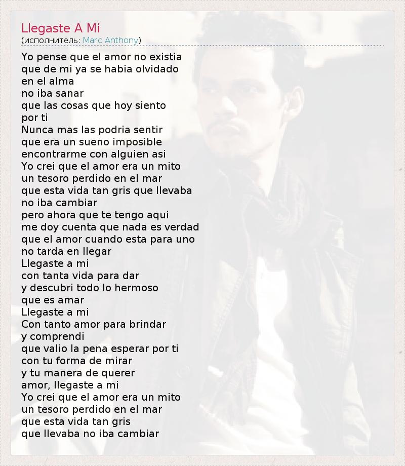Yo pense que el amor no existia que de mi ya se habia olvidado en el alma no iba sanar que las cosas que hoy siento por ti Nunca mas las podria sentir que era un sueno imposible encontrarme con alguien asi Yo crei que el amor era un mito un tesoro perdido en el mar que esta vida tan gris que llevaba no iba cambiar pero ahora que te tengo aqui me doy cuenta que nada es verdad que el amor cuando esta para uno no tarda en llegar Llegaste a mi con tanta vida para dar y descubri todo lo hermoso que es amar Llegaste a mi Con tanto amor para brindar y comprendi que valio la pena esperar por ti con tu forma de mirar y tu manera de querer amor, llegaste a mi Yo crei que el amor era un mito un tesoro perdido en el mar que esta vida tan gris que llevaba no iba cambiar
