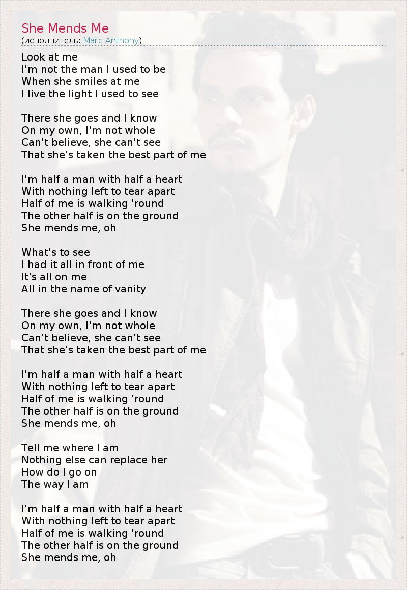 Взгляни на меня Я не тот, что раньше Когда она улыбается мне Я живу светом, который видел раньше Она там и я знаю, что Сам по себе, я не целый Не могу поверить, что она не понимает Что забрала лучшую часть меня Я половина человека с половинкой сердца И не осталось ничего, что можно разорвать на части Одна моя половинка бродит неподалеку Другая - стоит на земле Она чинит меня, о Как я мог не заметить Все было прямо передо мной Во всем этом виноват я Все это было во имя тщеславия Она там и я знаю, что Сам по себе, я не целый Не могу поверить, она не понимает Что забрала лучшую часть меня Я половина человека с половинкой сердца И не осталось ничего, что можно разорвать на части Одна моя половинка бродит неподалеку Другая - стоит на земле Она чинит меня, о Скажи мне, где я Ничто не может заменить её Как мне Жить дальше Я половина человека с половинкой сердца И не осталось ничего, что можно разорвать на части Одна моя половинка бродит неподалеку Другая - стоит на земле Она чинит меня, о