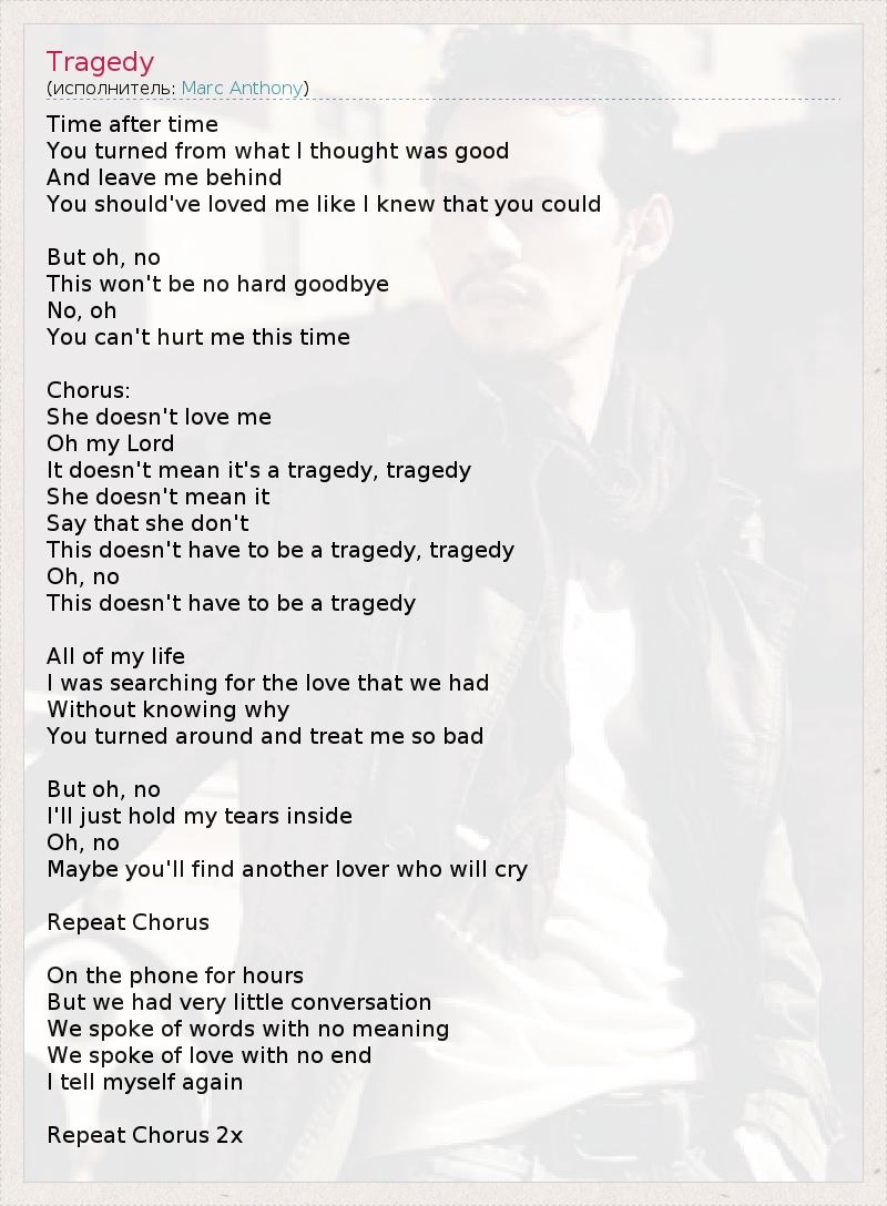 Time after time You turned from what I thought was good And leave me behind You should've loved me like I knew that you could But oh, no This won't be no hard goodbye No, oh You can't hurt me this time Chorus: She doesn't love me Oh my Lord It doesn't mean it's a tragedy, tragedy She doesn't mean it Say that she don't This doesn't have to be a tragedy, tragedy Oh, no This doesn't have to be a tragedy All of my life I was searching for the love that we had Without knowing why You turned around and treat me so bad But oh, no I'll just hold my tears inside Oh, no Maybe you'll find another lover who will cry Repeat Chorus On the phone for hours But we had very little conversation We spoke of words with no meaning We spoke of love with no end I tell myself again Repeat Chorus 2x