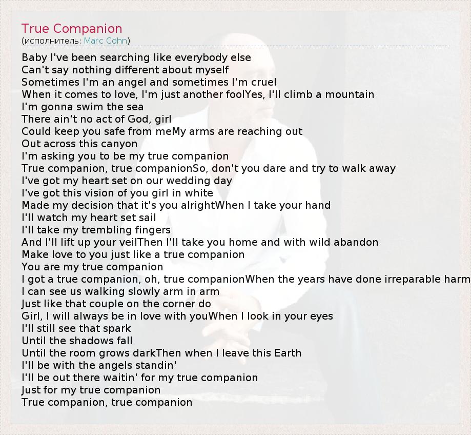 I got a true companion, oh, true companionWhen the years have done irreparable harm