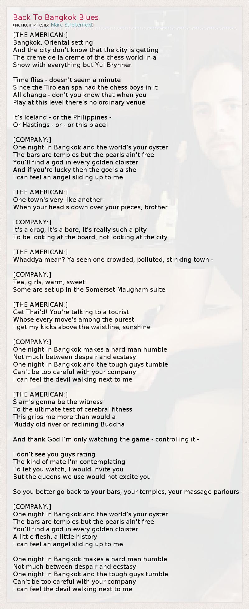 А как ты думаешь, о чем песня "Back To Bangkok Blues" ?