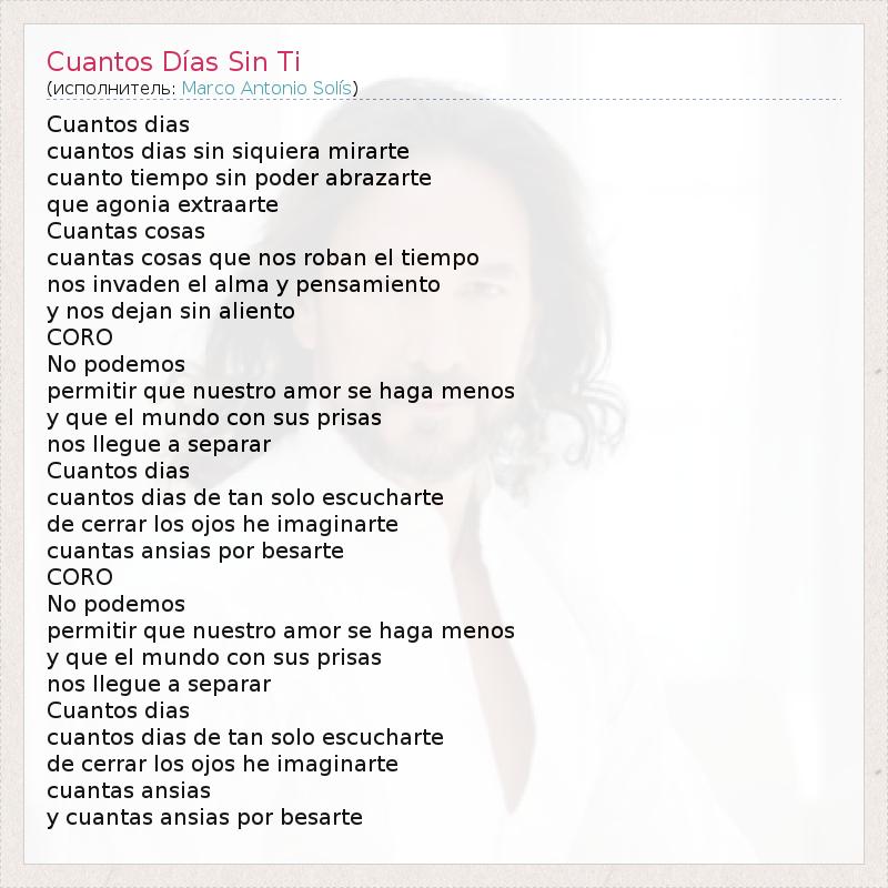 Cuantos dias cuantos dias sin siquiera mirarte cuanto tiempo sin poder abrazarte que agonia extraarte Cuantas cosas cuantas cosas que nos roban el tiempo nos invaden el alma y pensamiento y nos dejan sin aliento CORO No podemos permitir que nuestro amor se haga menos y que el mundo con sus prisas nos llegue a separar Cuantos dias cuantos dias de tan solo escucharte de cerrar los ojos he imaginarte cuantas ansias por besarte CORO No podemos permitir que nuestro amor se haga menos y que el mundo con sus prisas nos llegue a separar Cuantos dias cuantos dias de tan solo escucharte de cerrar los ojos he imaginarte cuantas ansias y cuantas ansias por besarte
