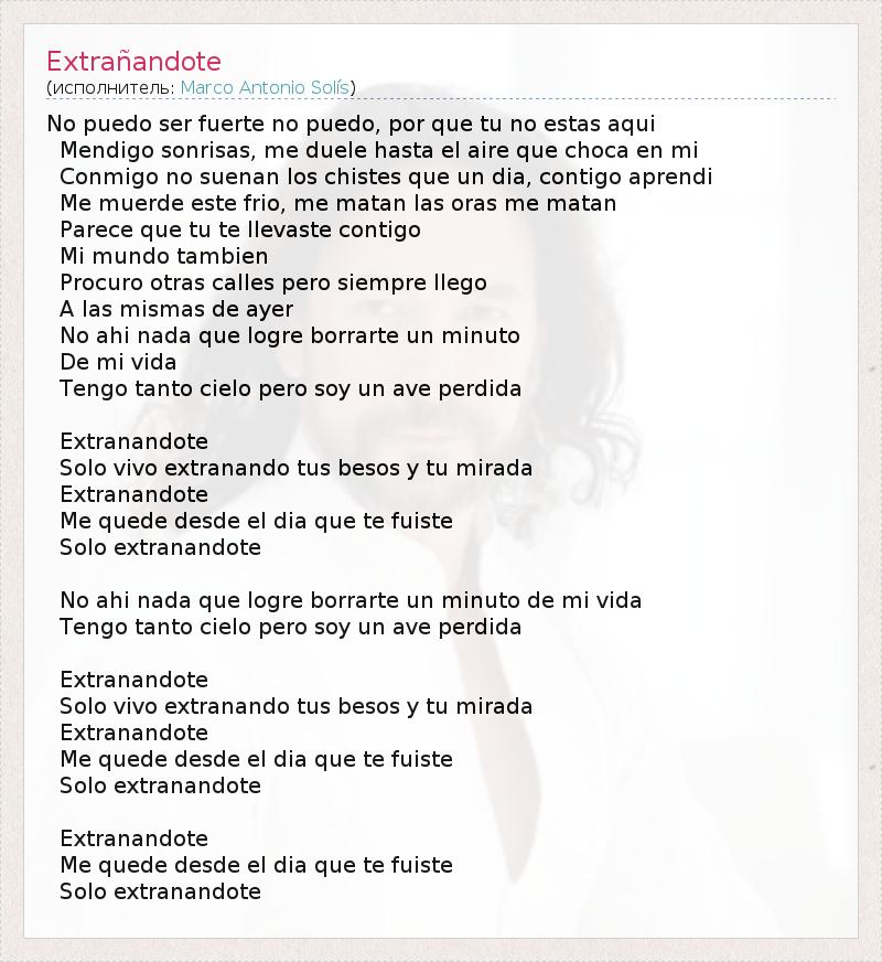No puedo ser fuerte no puedo, por que tu no estas aqui Mendigo sonrisas, me duele hasta el aire que choca en mi Conmigo no suenan los chistes que un dia, contigo aprendi Me muerde este frio, me matan las oras me matan Parece que tu te llevaste contigo Mi mundo tambien Procuro otras calles pero siempre llego A las mismas de ayer No ahi nada que logre borrarte un minuto De mi vida Tengo tanto cielo pero soy un ave perdida Extranandote Solo vivo extranando tus besos y tu mirada Extranandote Me quede desde el dia que te fuiste Solo extranandote No ahi nada que logre borrarte un minuto de mi vida Tengo tanto cielo pero soy un ave perdida Extranandote Solo vivo extranando tus besos y tu mirada Extranandote Me quede desde el dia que te fuiste Solo extranandote Extranandote Me quede desde el dia que te fuiste Solo extranandote