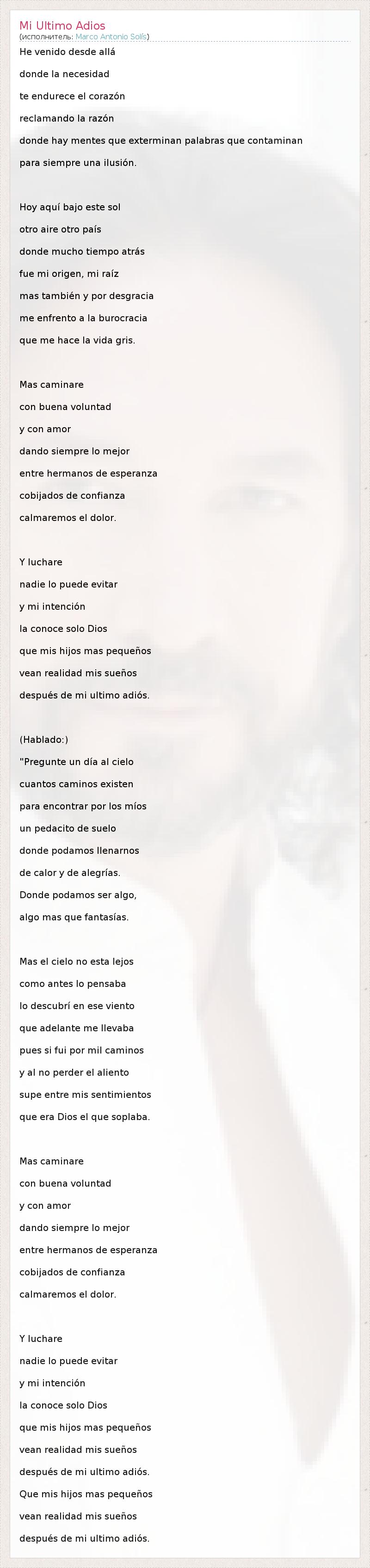 He venido desde allá donde la necesidad te endurece el corazón reclamando la razón donde hay mentes que exterminan palabras que contaminan para siempre una ilusión. Hoy aquí bajo este sol otro aire otro país donde mucho tiempo atrás fue mi origen, mi raíz mas también y por desgracia me enfrento a la burocracia que me hace la vida gris. Mas caminare con buena voluntad y con amor dando siempre lo mejor entre hermanos de esperanza cobijados de confianza calmaremos el dolor. Y luchare nadie lo puede evitar y mi intención la conoce solo Dios que mis hijos mas pequeños vean realidad mis sueños después de mi ultimo adiós. (Hablado:) "Pregunte un día al cielo cuantos caminos existen para encontrar por los míos un pedacito de suelo donde podamos llenarnos de calor y de alegrías. Donde podamos ser algo, algo mas que fantasías. Mas el cielo no esta lejos como antes lo pensaba lo descubrí en ese viento que adelante me llevaba pues si fui por mil caminos y al no perder el aliento supe entre mis sentimientos que era Dios el que soplaba. Mas caminare con buena voluntad y con amor dando siempre lo mejor entre hermanos de esperanza cobijados de confianza calmaremos el dolor. Y luchare nadie lo puede evitar y mi intención la conoce solo Dios que mis hijos mas pequeños vean realidad mis sueños después de mi ultimo adiós. Que mis hijos mas pequeños vean realidad mis sueños después de mi ultimo adiós.