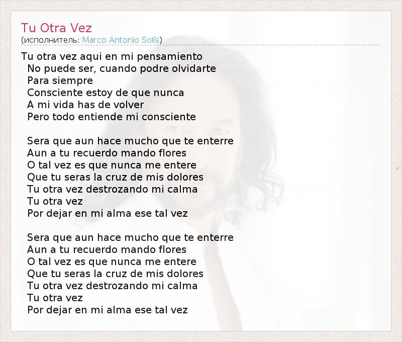 Tu otra vez aqui en mi pensamiento No puede ser, cuando podre olvidarte Para siempre Consciente estoy de que nunca A mi vida has de volver Pero todo entiende mi consciente Sera que aun hace mucho que te enterre Aun a tu recuerdo mando flores O tal vez es que nunca me entere Que tu seras la cruz de mis dolores Tu otra vez destrozando mi calma Tu otra vez Por dejar en mi alma ese tal vez Sera que aun hace mucho que te enterre Aun a tu recuerdo mando flores O tal vez es que nunca me entere Que tu seras la cruz de mis dolores Tu otra vez destrozando mi calma Tu otra vez Por dejar en mi alma ese tal vez
