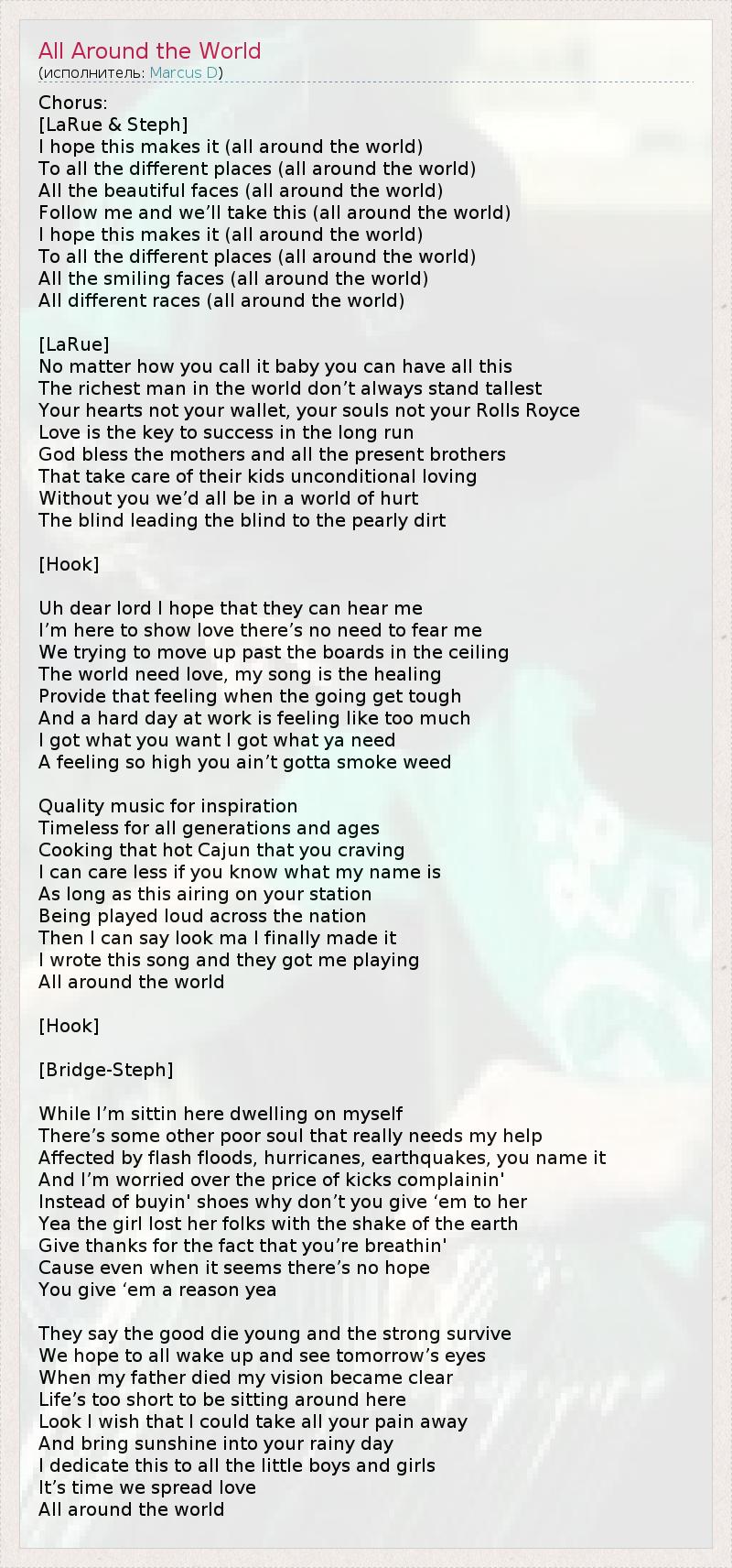 Chorus: [LaRue & Steph] I hope this makes it (all around the world) To all the different places (all around the world) All the beautiful faces (all around the world) Follow me and we’ll take this (all around the world) I hope this makes it (all around the world) To all the different places (all around the world) All the smiling faces (all around the world) All different races (all around the world) [LaRue] No matter how you call it baby you can have all this The richest man in the world don’t always stand tallest Your hearts not your wallet, your souls not your Rolls Royce Love is the key to success in the long run God bless the mothers and all the present brothers That take care of their kids unconditional loving Without you we’d all be in a world of hurt The blind leading the blind to the pearly dirt [Hook] Uh dear lord I hope that they can hear me I’m here to show love there’s no need to fear me We trying to move up past the boards in the ceiling The world need love, my song is the healing Provide that feeling when the going get tough And a hard day at work is feeling like too much I got what you want I got what ya need A feeling so high you ain’t gotta smoke weed Quality music for inspiration Timeless for all generations and ages Cooking that hot Cajun that you craving I can care less if you know what my name is As long as this airing on your station Being played loud across the nation Then I can say look ma I finally made it I wrote this song and they got me playing All around the world [Hook] [Bridge-Steph] While I’m sittin here dwelling on myself There’s some other poor soul that really needs my help Affected by flash floods, hurricanes, earthquakes, you name it And I’m worried over the price of kicks complainin' Instead of buyin' shoes why don’t you give ‘em to her Yea the girl lost her folks with the shake of the earth Give thanks for the fact that you’re breathin' Cause even when it seems there’s no hope You give ‘em a reason yea They say the good die young and the strong survive We hope to all wake up and see tomorrow’s eyes When my father died my vision became clear Life’s too short to be sitting around here Look I wish that I could take all your pain away And bring sunshine into your rainy day I dedicate this to all the little boys and girls It’s time we spread love All around the world