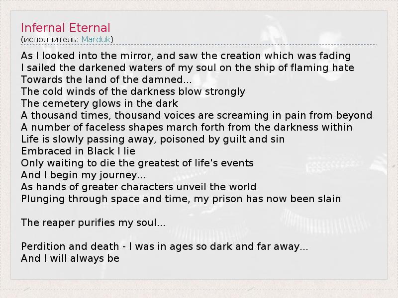 "Адский Вечный" Как незагляну в зеркало, вижу существо которое вянет Я проплыл тёмные воды своей душы на корабле горящей ненависти Подплывая к земле падшых.. Холодные ветры тьмы дуют сильно Кладбище светится в темноте Тысячу раз, тысячи голосов кричат под пыткой недалеко Много безликих форм маршируют, в пределах тьмы Жизнь медленно утекает, отравленая виной и грехом Охваченый Чёрным я лгу Всего-то ожидая смерти величайшего из жизненых событий И я начал своё путешествие.. Как руки величайших открыли мир Падая сквозь космос и время, моё заключение теперь закончено Потрошитель очистил мою душу.. Проклятие и смерть – Я был в эрах таких далёких и таких дальних.. И я всегда буду.