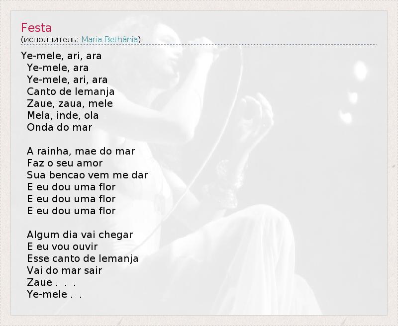 Это интересно:Голос бразильской примы Марии Бетании низкий, почти мужской, очень яркий, сильный, подходит для самых разных жанров от самбы до джаза. В ее обширной дискографии баллады и босса нова, танго и регги, песни в ее исполнении часто используются в сериалах ("Сладкий ручей", "Нежный яд", "Во имя любви" "В мире женщин", "Тихие страсти Мадалены", "Непокорная", "Лабиринт",... продолжение