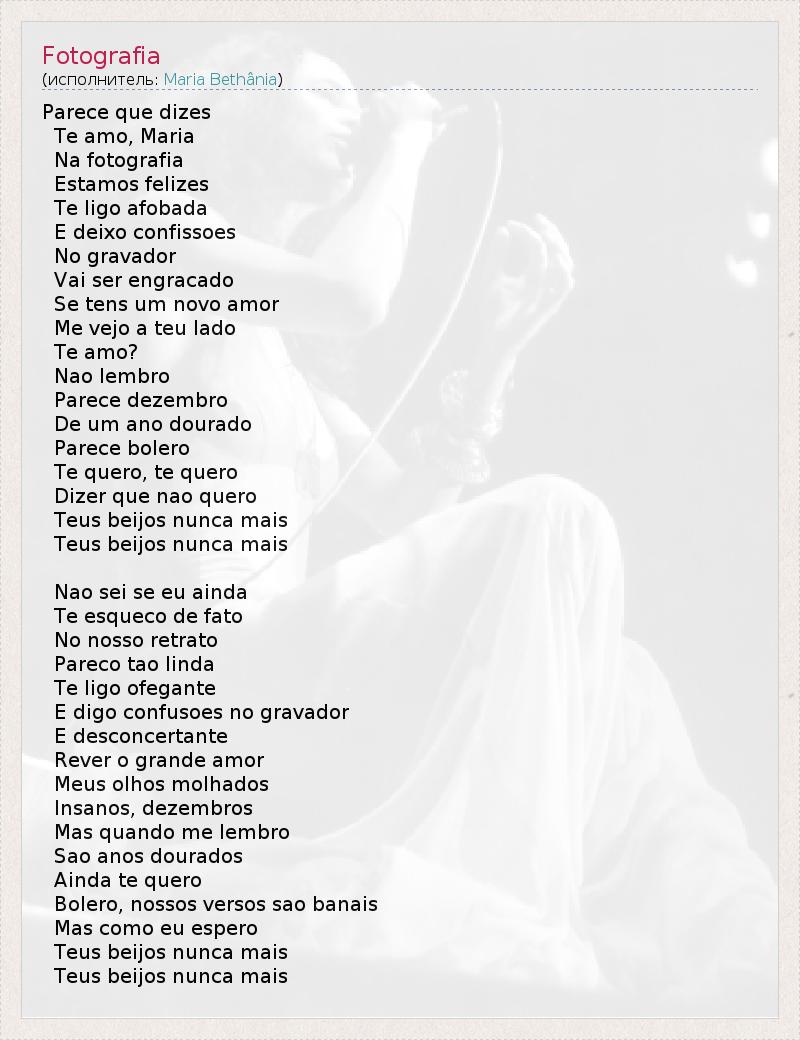 Parece que dizes Te amo, Maria Na fotografia Estamos felizes Te ligo afobada E deixo confissoes No gravador Vai ser engracado Se tens um novo amor Me vejo a teu lado Te amo? Nao lembro Parece dezembro De um ano dourado Parece bolero Te quero, te quero Dizer que nao quero Teus beijos nunca mais Teus beijos nunca mais Nao sei se eu ainda Te esqueco de fato No nosso retrato Pareco tao linda Te ligo ofegante E digo confusoes no gravador E desconcertante Rever o grande amor Meus olhos molhados Insanos, dezembros Mas quando me lembro Sao anos dourados Ainda te quero Bolero, nossos versos sao banais Mas como eu espero Teus beijos nunca mais Teus beijos nunca mais