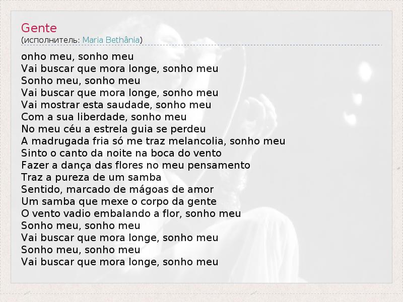Это интересно:Голос бразильской примы Марии Бетании низкий, почти мужской, очень яркий, сильный, подходит для самых разных жанров от самбы до джаза. В ее обширной дискографии баллады и босса нова, танго и регги, песни в ее исполнении часто используются в сериалах ("Сладкий ручей", "Нежный яд", "Во имя любви" "В мире женщин", "Тихие страсти Мадалены", "Непокорная", "Лабиринт",... продолжение