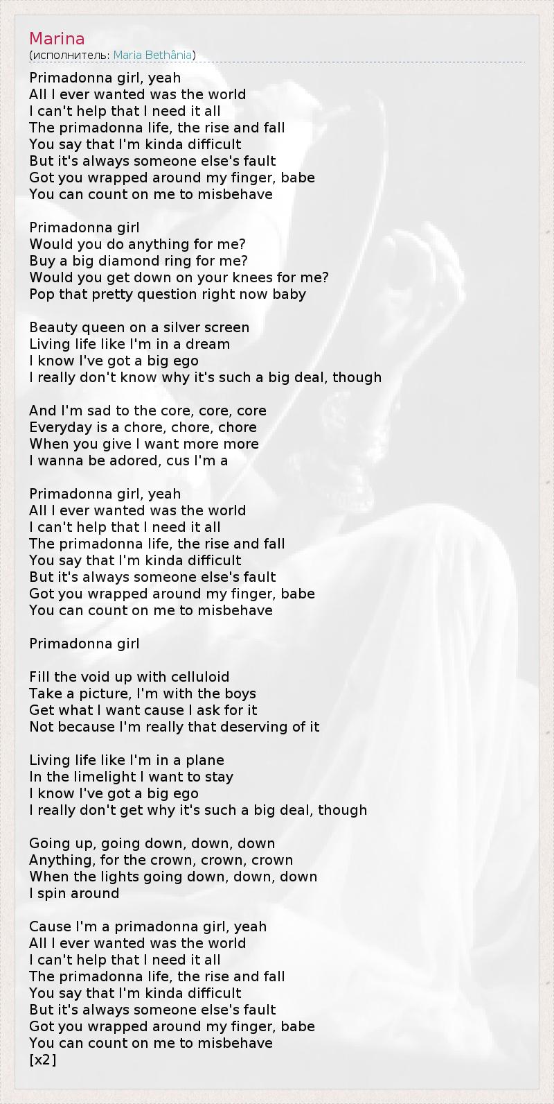 Это интересно:Голос бразильской примы Марии Бетании низкий, почти мужской, очень яркий, сильный, подходит для самых разных жанров от самбы до джаза. В ее обширной дискографии баллады и босса нова, танго и регги, песни в ее исполнении часто используются в сериалах ("Сладкий ручей", "Нежный яд", "Во имя любви" "В мире женщин", "Тихие страсти Мадалены", "Непокорная", "Лабиринт",... продолжение