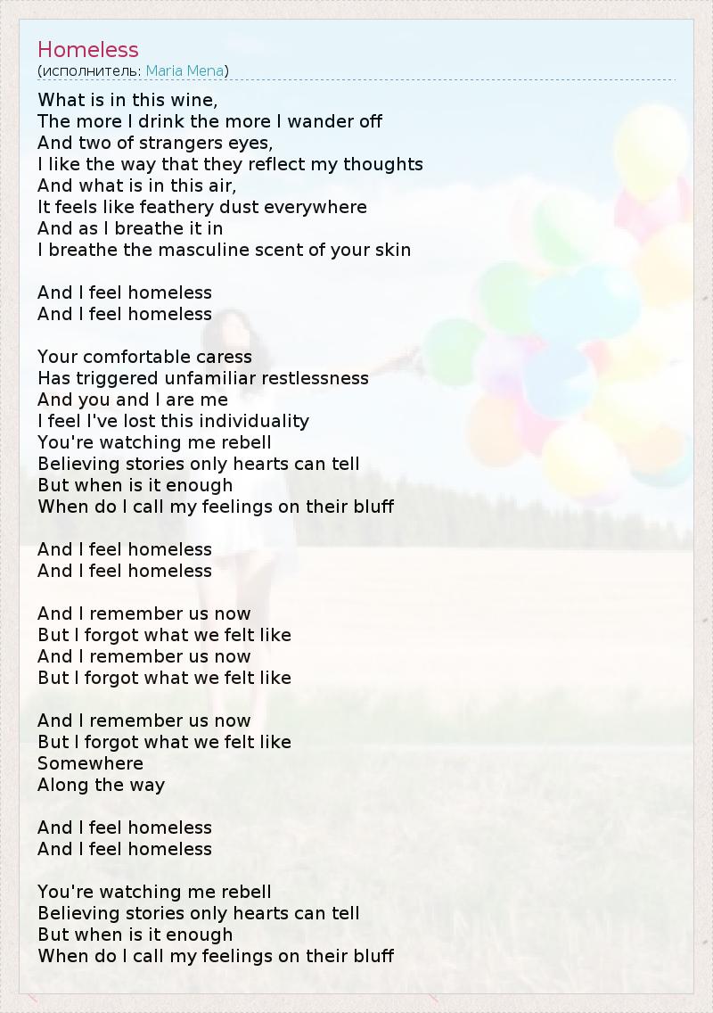 Что же в этом вине? Чем больше я пью, тем больше я теряюсь В глазах незнакомца; Мне нравится, как они отражают мои мысли. Что же в этом воздухе? Он словно полон невесомой пыли, И когда я вдыхаю его, Я вдыхаю мужской запах его кожи. И я чувствую себя бездомной. И я чувствую себя бездомной. Твои уютные ласки Вызывают незнакомое беспокойство. И ты, и я – это я, Я чувствую, что потеряла свою индивидуальность. Ты смотришь, как я восстаю, Веря в истории, которые могут рассказывать лишь сердца. Но когда же этого будет достаточно, Когда же я смогу раскрыть свои чувства? И я чувствую себя бездомной. И я чувствую себя бездомной. И сейчас я помню нас, Но я забыла, что мы чувствовали. И сейчас я помню нас, Но я забыла, что мы чувствовали. И сейчас я помню нас, Но я забыла, что мы чувствовали Где-то По пути... И я чувствую себя бездомной. И я чувствую себя бездомной. Ты смотришь, как я восстаю, Веря в истории, которые могут рассказывать лишь сердца. Но когда же этого будет достаточно, Когда же я смогу раскрыть свои чувства?