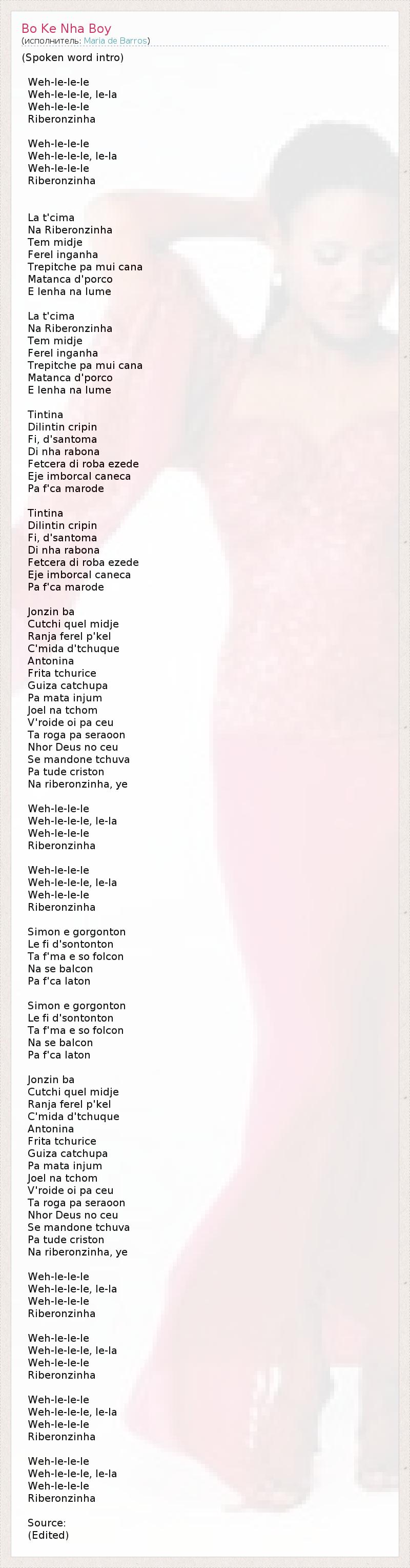 (Spoken word intro) Weh-le-le-le Weh-le-le-le, le-la Weh-le-le-le Riberonzinha Weh-le-le-le Weh-le-le-le, le-la Weh-le-le-le Riberonzinha La t'cima Na Riberonzinha Tem midje Ferel inganha Trepitche pa mui cana Matanca d'porco E lenha na lume La t'cima Na Riberonzinha Tem midje Ferel inganha Trepitche pa mui cana Matanca d'porco E lenha na lume Tintina Dilintin cripin Fi, d'santoma Di nha rabona Fetcera di roba ezede Eje imborcal caneca Pa f'ca marode Tintina Dilintin cripin Fi, d'santoma Di nha rabona Fetcera di roba ezede Eje imborcal caneca Pa f'ca marode Jonzin ba Cutchi quel midje Ranja ferel p'kel C'mida d'tchuque Antonina Frita tchurice Guiza catchupa Pa mata injum Joel na tchom V'roide oi pa ceu Ta roga pa seraoon Nhor Deus no ceu Se mandone tchuva Pa tude criston Na riberonzinha, ye Weh-le-le-le Weh-le-le-le, le-la Weh-le-le-le Riberonzinha Weh-le-le-le Weh-le-le-le, le-la Weh-le-le-le Riberonzinha Simon e gorgonton Le fi d'sontonton Ta f'ma e so folcon Na se balcon Pa f'ca laton Simon e gorgonton Le fi d'sontonton Ta f'ma e so folcon Na se balcon Pa f'ca laton Jonzin ba Cutchi quel midje Ranja ferel p'kel C'mida d'tchuque Antonina Frita tchurice Guiza catchupa Pa mata injum Joel na tchom V'roide oi pa ceu Ta roga pa seraoon Nhor Deus no ceu Se mandone tchuva Pa tude criston Na riberonzinha, ye Weh-le-le-le Weh-le-le-le, le-la Weh-le-le-le Riberonzinha Weh-le-le-le Weh-le-le-le, le-la Weh-le-le-le Riberonzinha Weh-le-le-le Weh-le-le-le, le-la Weh-le-le-le Riberonzinha Weh-le-le-le Weh-le-le-le, le-la Weh-le-le-le Riberonzinha Source: (Edited)