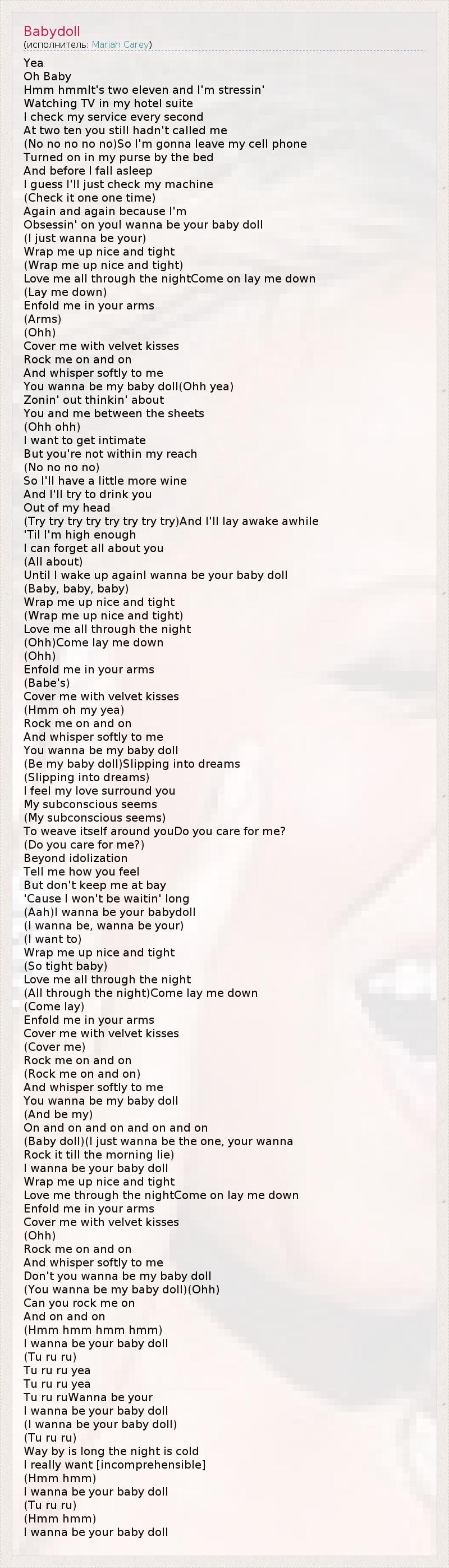 Yea Oh Baby Hmm hmmIt's two eleven and I'm stressin' Watching TV in my hotel suite I check my service every second At two ten you still hadn't called me (No no no no no)So I'm gonna leave my cell phone Turned on in my purse by the bed And before I fall asleep I guess I'll just check my machine (Check it one one time) Again and again because I'm Obsessin' on youI wanna be your baby doll (I just wanna be your) Wrap me up nice and tight (Wrap me up nice and tight) Love me all through the nightCome on lay me down (Lay me down) Enfold me in your arms (Arms) (Ohh) Cover me with velvet kisses Rock me on and on And whisper softly to me You wanna be my baby doll(Ohh yea) Zonin' out thinkin' about You and me between the sheets (Ohh ohh) I want to get intimate But you're not within my reach (No no no no) So I'll have a little more wine And I'll try to drink you Out of my head (Try try try try try try try try)And I'll lay awake awhile 'Til I'm high enough I can forget all about you (All about) Until I wake up againI wanna be your baby doll (Baby, baby, baby) Wrap me up nice and tight (Wrap me up nice and tight) Love me all through the night (Ohh)Come lay me down (Ohh) Enfold me in your arms (Babe's) Cover me with velvet kisses (Hmm oh my yea) Rock me on and on And whisper softly to me You wanna be my baby doll (Be my baby doll)Slipping into dreams (Slipping into dreams) I feel my love surround you My subconscious seems (My subconscious seems) To weave itself around youDo you care for me? (Do you care for me?) Beyond idolization Tell me how you feel But don't keep me at bay 'Cause I won't be waitin' long (Aah)I wanna be your babydoll (I wanna be, wanna be your) (I want to) Wrap me up nice and tight (So tight baby) Love me all through the night (All through the night)Come lay me down (Come lay) Enfold me in your arms Cover me with velvet kisses (Cover me) Rock me on and on (Rock me on and on) And whisper softly to me You wanna be my baby doll (And be my) On and on and on and on and on (Baby doll)(I just wanna be the one, your wanna Rock it till the morning lie) I wanna be your baby doll Wrap me up nice and tight Love me through the nightCome on lay me down Enfold me in your arms Cover me with velvet kisses (Ohh) Rock me on and on And whisper softly to me Don't you wanna be my baby doll (You wanna be my baby doll)(Ohh) Can you rock me on And on and on (Hmm hmm hmm hmm) I wanna be your baby doll (Tu ru ru) Tu ru ru yea Tu ru ru yea Tu ru ruWanna be your I wanna be your baby doll (I wanna be your baby doll) (Tu ru ru) Way by is long the night is cold I really want [incomprehensible] (Hmm hmm) I wanna be your baby doll (Tu ru ru) (Hmm hmm) I wanna be your baby doll