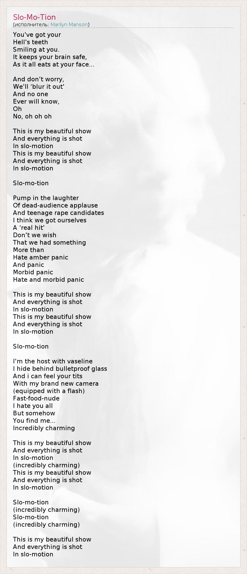 Твои Адские зубы Дико улыбаются. Ты можешь не напрягать мозги, Пока улыбка расплывается на все твое лицо. И не волнуйся, Мы все "заретушируем", И никто Никогда не узнает, О, Нет, о, о, о.. Это мое прекрасное шоу, Где все снято В замедленном действии. Это мое прекрасное шоу, Где все снято В замедленном действии. Замедленное действие Добавим смеха, Аплодисментов мертвой публики И малолетних кандидатов на изнасилование. Я думаю, у нас получится "Настоящий хит". Разве мы не хотим Чего-то большего, Чем Ненависть и паника в желтом цвете, И паника, Безумная паника, Ненависть и безумная паника. Это мое прекрасное шоу, Где все снято В замедленном действии. Это мое прекрасное шоу, Где все снято В замедленном действии. Замедленное действие Я хозяин с вазелином, Я прячусь за пуленепробиваемым стеклом. И я могу чувствовать твои сиськи Моей новой камерой (со вспышкой). Обнаженный фаст-фуд – Я ненавижу вас всех, Но почему-то Вы находите меня Невероятно очаровательным. Это мое прекрасное шоу, Где все снято В замедленном действии. (невероятно очаровательно) Это мое прекрасное шоу, Где все снято В замедленном действии. Замедленное действие (невероятно очаровательно) Замедленное действие (невероятно очаровательно) Это мое прекрасное шоу, Где все снято В замедленном действии.