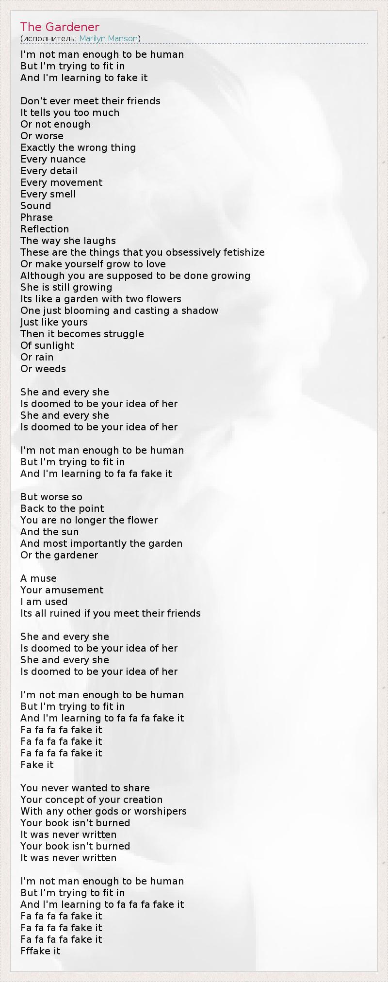 I'm not man enough to be human But I'm trying to fit in And I'm learning to fake it Don't ever meet their friends It tells you too much Or not enough Or worse Exactly the wrong thing Every nuance Every detail Every movement Every smell Sound Phrase Reflection The way she laughs These are the things that you obsessively fetishize Or make yourself grow to love Although you are supposed to be done growing She is still growing Its like a garden with two flowers One just blooming and casting a shadow Just like yours Then it becomes struggle Of sunlight Or rain Or weeds She and every she Is doomed to be your idea of her She and every she Is doomed to be your idea of her I'm not man enough to be human But I'm trying to fit in And I'm learning to fa fa fake it But worse so Back to the point You are no longer the flower And the sun And most importantly the garden Or the gardener A muse Your amusement I am used Its all ruined if you meet their friends She and every she Is doomed to be your idea of her She and every she Is doomed to be your idea of her I'm not man enough to be human But I'm trying to fit in And I'm learning to fa fa fa fake it Fa fa fa fa fake it Fa fa fa fa fake it Fa fa fa fa fake it Fake it You never wanted to share Your concept of your creation With any other gods or worshipers Your book isn't burned It was never written Your book isn't burned It was never written I'm not man enough to be human But I'm trying to fit in And I'm learning to fa fa fa fake it Fa fa fa fa fake it Fa fa fa fa fake it Fa fa fa fa fake it Fffake it