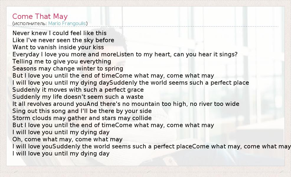 I will love youSuddenly the world seems such a perfect placeCome what may, come what may
