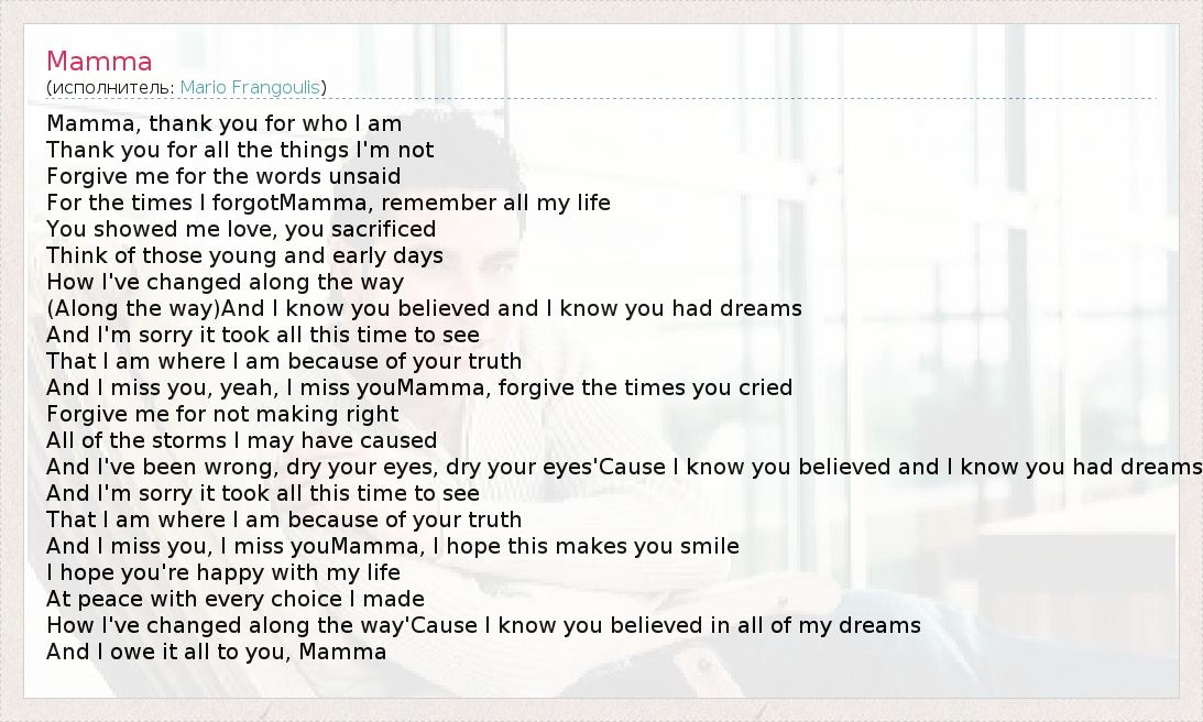 And I miss you, yeah, I miss youMamma, forgive the times you cried