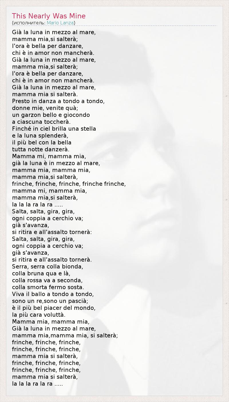 Это интересно:Марио Ланца (настоящее имя Альфредо Арнольдо Кокоцца), американский тенор, киноактер. Родился 31 января 1921 года в Филадельфии, в семье Антонио Кокоцца и Марии Кокоцца-Ланца. Из мужского варианта имени матери и её девичьей фамилии (Марии Ланца) был составлен его псевдоним. Фильмы и записи Марио Ланца открыли чудо оперы тысячам людей, которым, не будь этих фильмов и песен, никогда бы не... продолжение